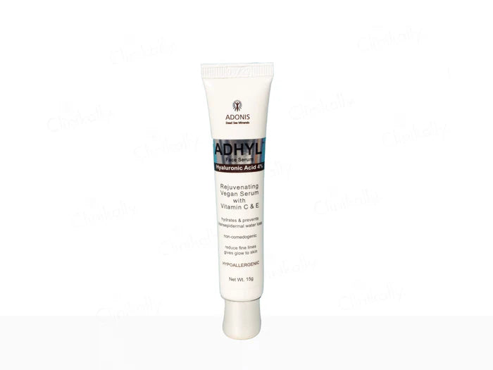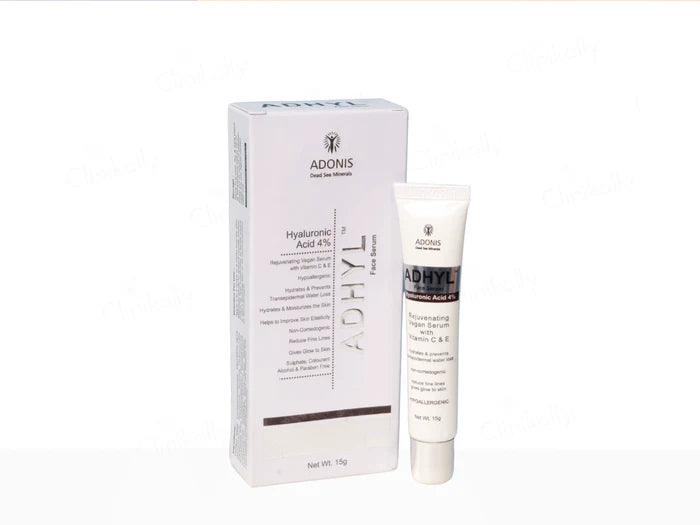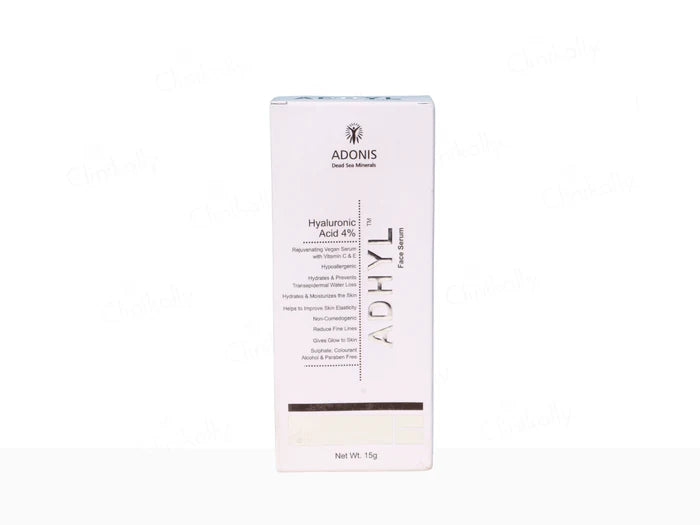 The main ingredients in Adonis Adhyl Face Serum include Hyaluronic Acid, Vitamin C, Vitamin E, and Dead Sea Minerals.