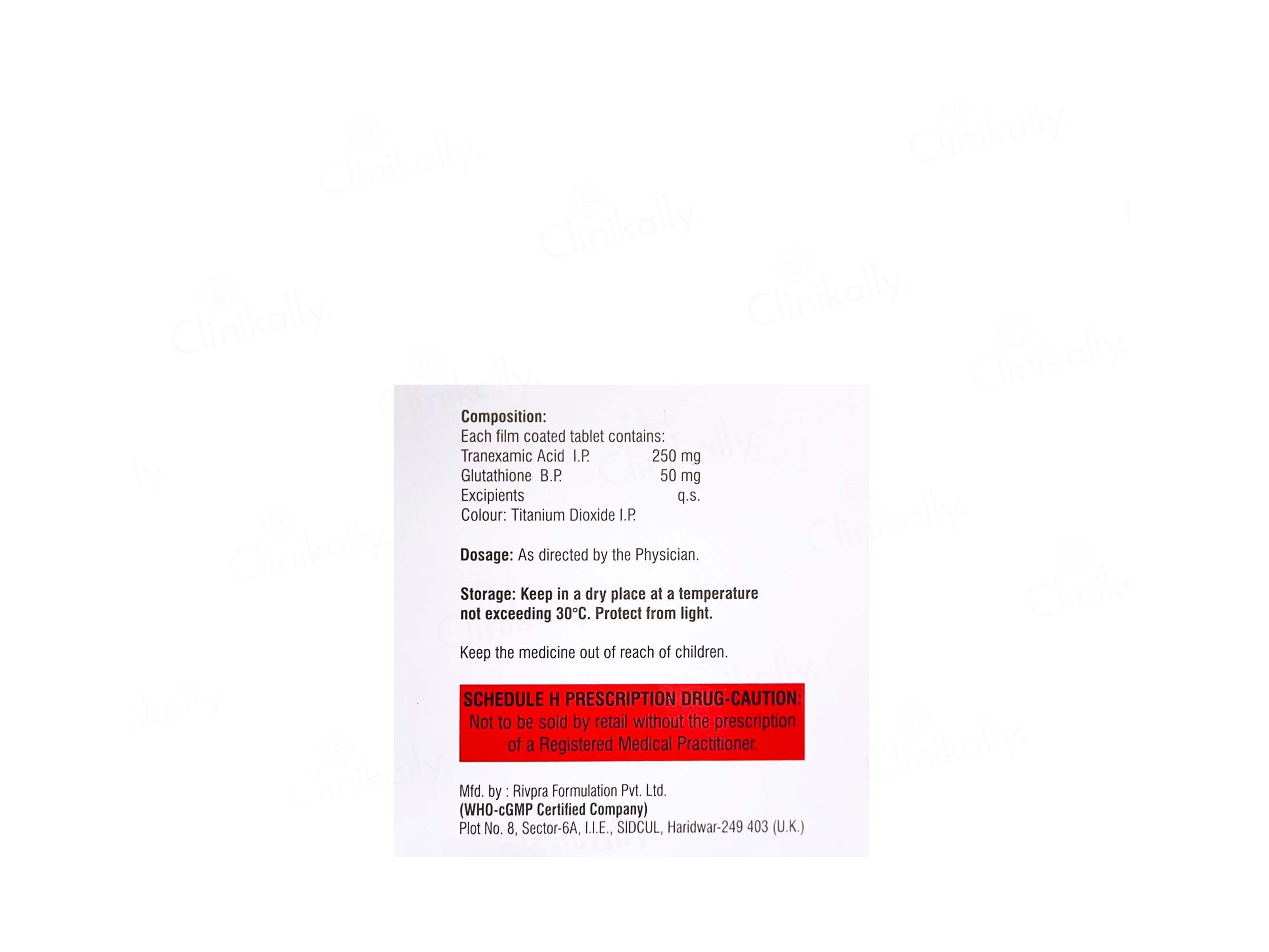 The tablet contains ingredients like Tranexamic Acid and L-Glutathione that inhibit melanin production and provide antioxidant protection, helping to reduce pigmentation and brighten the skin. /p>
