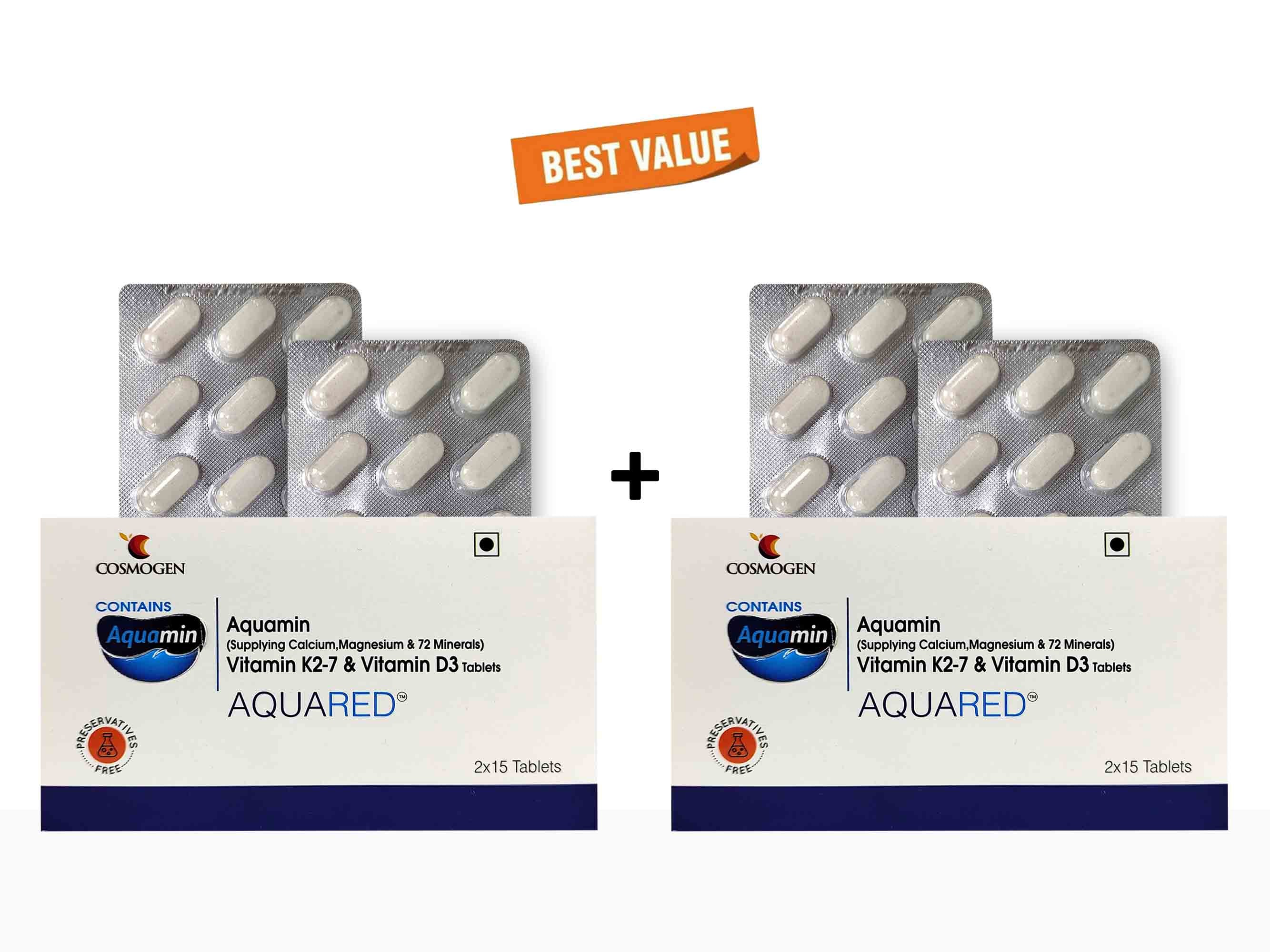 Aquared Aquamin, Vitamin K2-7 & Vitamin D3 Tablet contains Aquamin, Vitamin K2-7, and Vitamin D3.