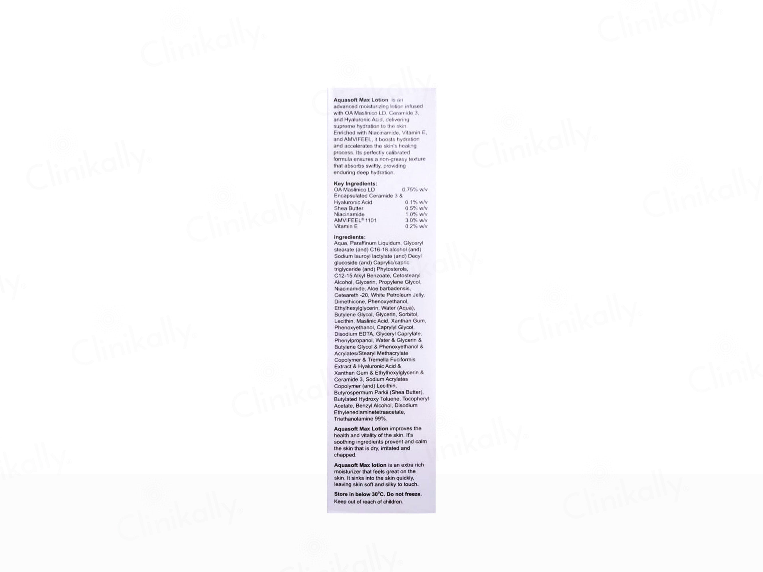 Aquasoft Max Intense Moisturizing Lotion is a paraben-free formulation designed to provide 24-hour hydration for all skin types. Enriched with natural ingredients like shea butter, squalane, sodium PCA, dexpanthenol, and ceramides, it binds moisture to the skin, preventing dryness and enhancing skin health. Its non-greasy texture absorbs quickly, leaving the skin soft, supple, and revitalized.