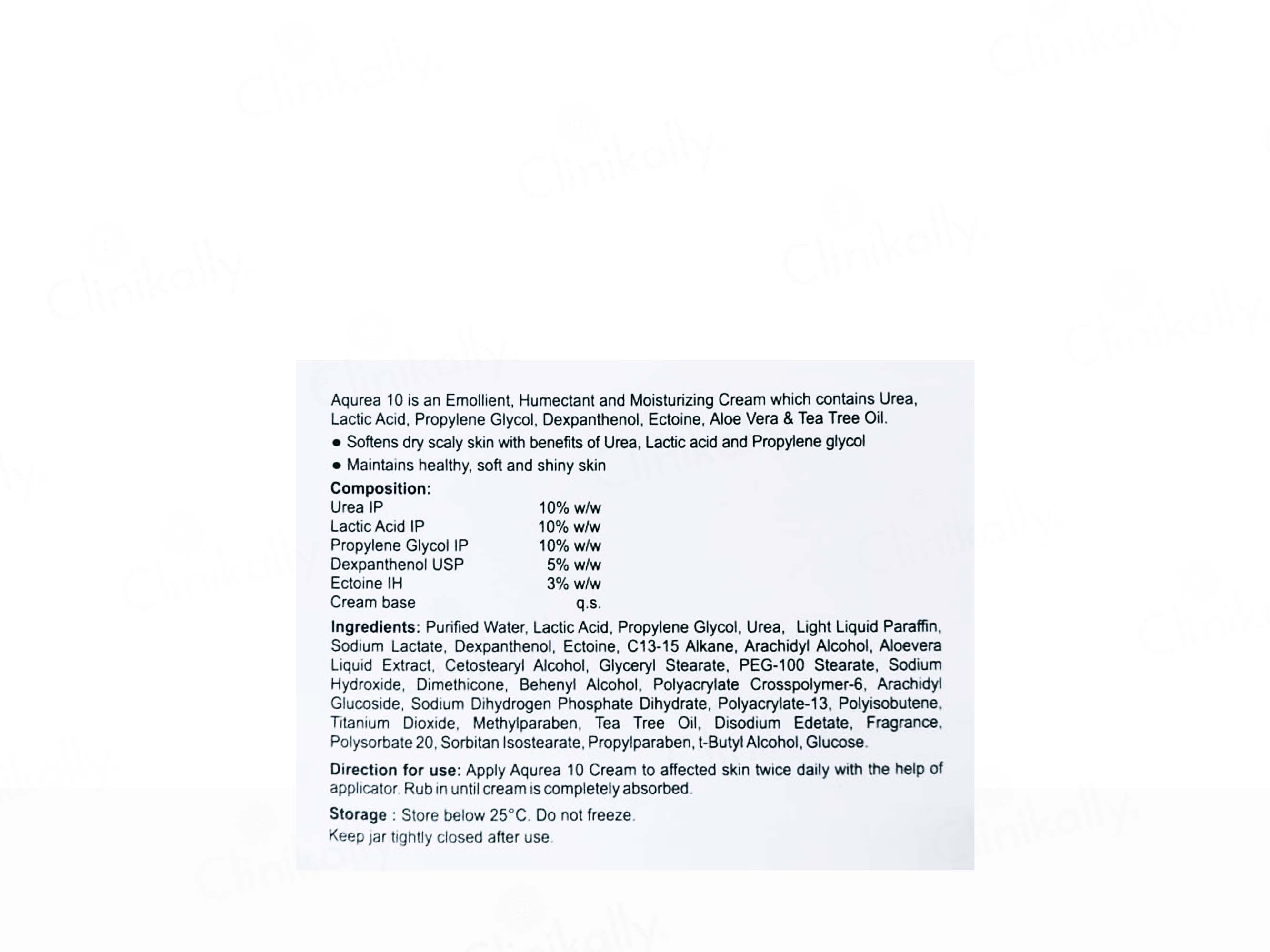 Aqurea 10 Moisturizing Urea Cream is a hydrating and barrier-repairing formula enriched with 10% urea, 10% lactic acid, aloe vera, and tea tree oil. It works as an emollient and humectant to deeply moisturize dry, scaly skin while promoting smoother texture and a healthy glow. With regular use, it helps repair the skin barrier, soothe rough patches, and lock in long-lasting hydration. Suitable for daily use, it leaves the skin soft, calm, and visibly healthier. Ideal for rough or thickened skin.
