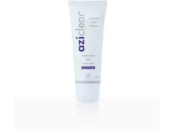 Aziclear Anti Acne Facial Cleanser contains salicylic acid and lactic acid, which micro-exfoliate to remove dead skin cells and improve skin tone.