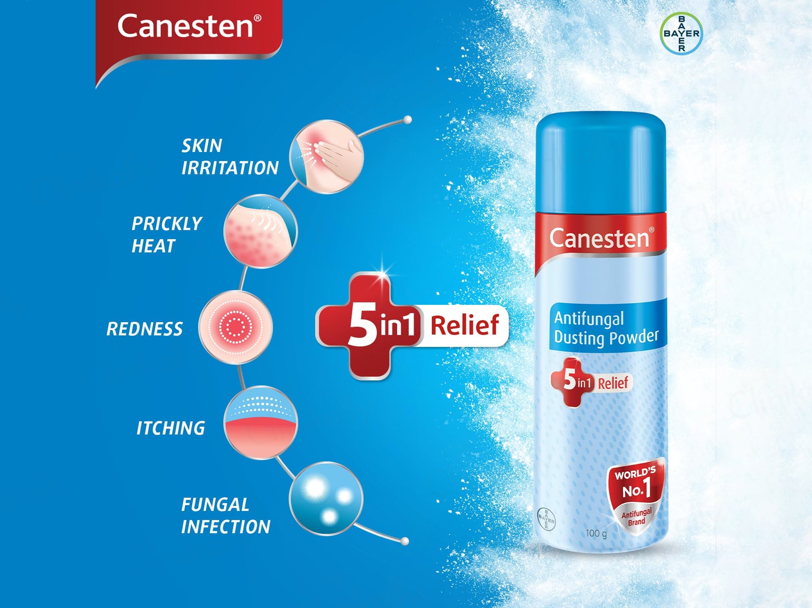 Canesten 5 in 1 Dusting Powder helps manage fungal infections, provides relief from itching and redness, prevents fungal spread, absorbs moisture, and is easy to apply.
