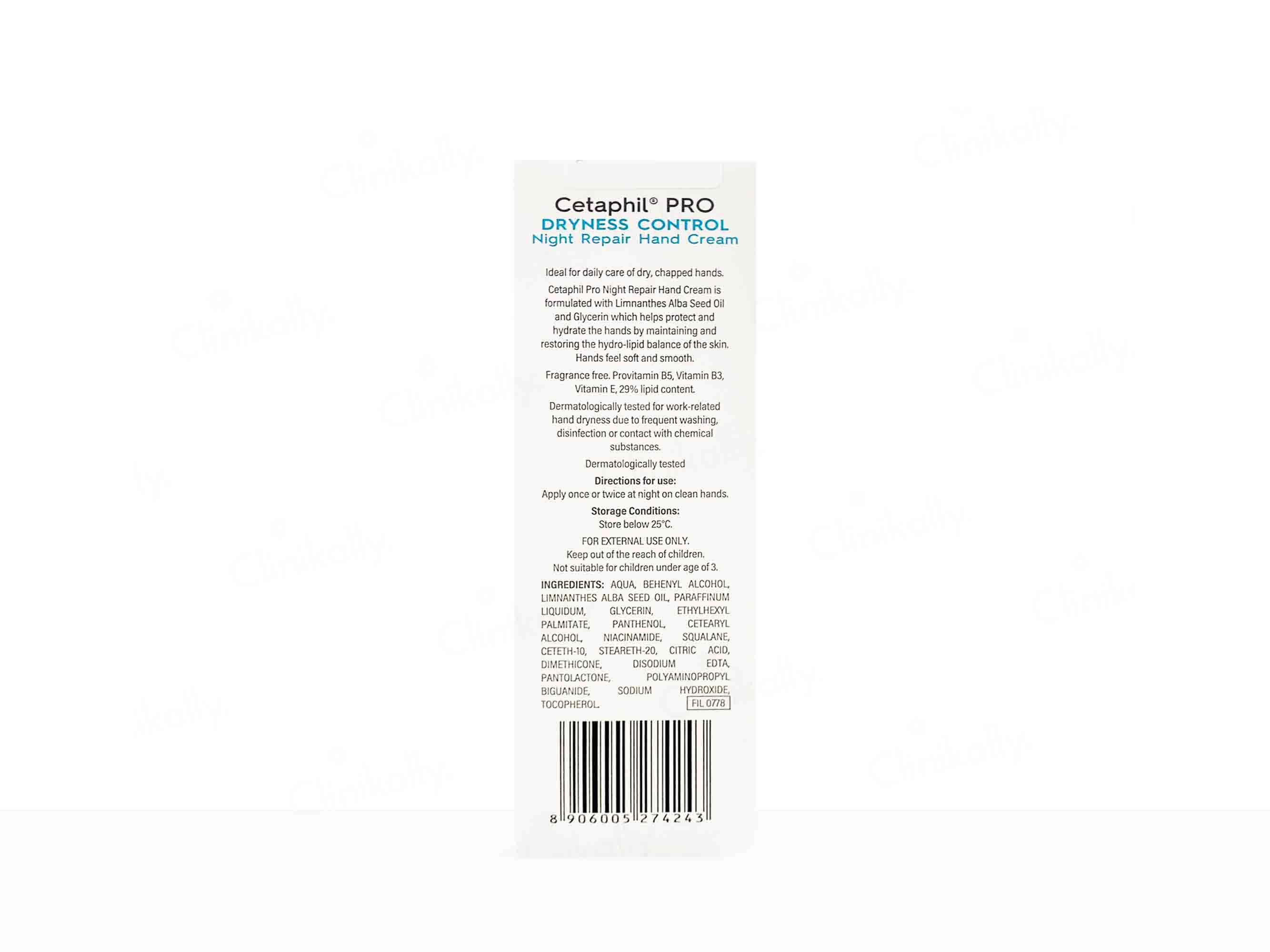 Cetaphil Pro Dryness Control Night Repair Hand Cream is specially formulated for dry to very dry hands. Clinically proven to repair the skin barrier overnight, it provides 24-hour hydration with a single application. Enriched with niacinamide, pro-vitamin B5, meadowfoam seed oil, and vitamin E, this non-sticky, hypoallergenic, and fragrance-free cream reduces skin roughness and restores softness and smoothness.