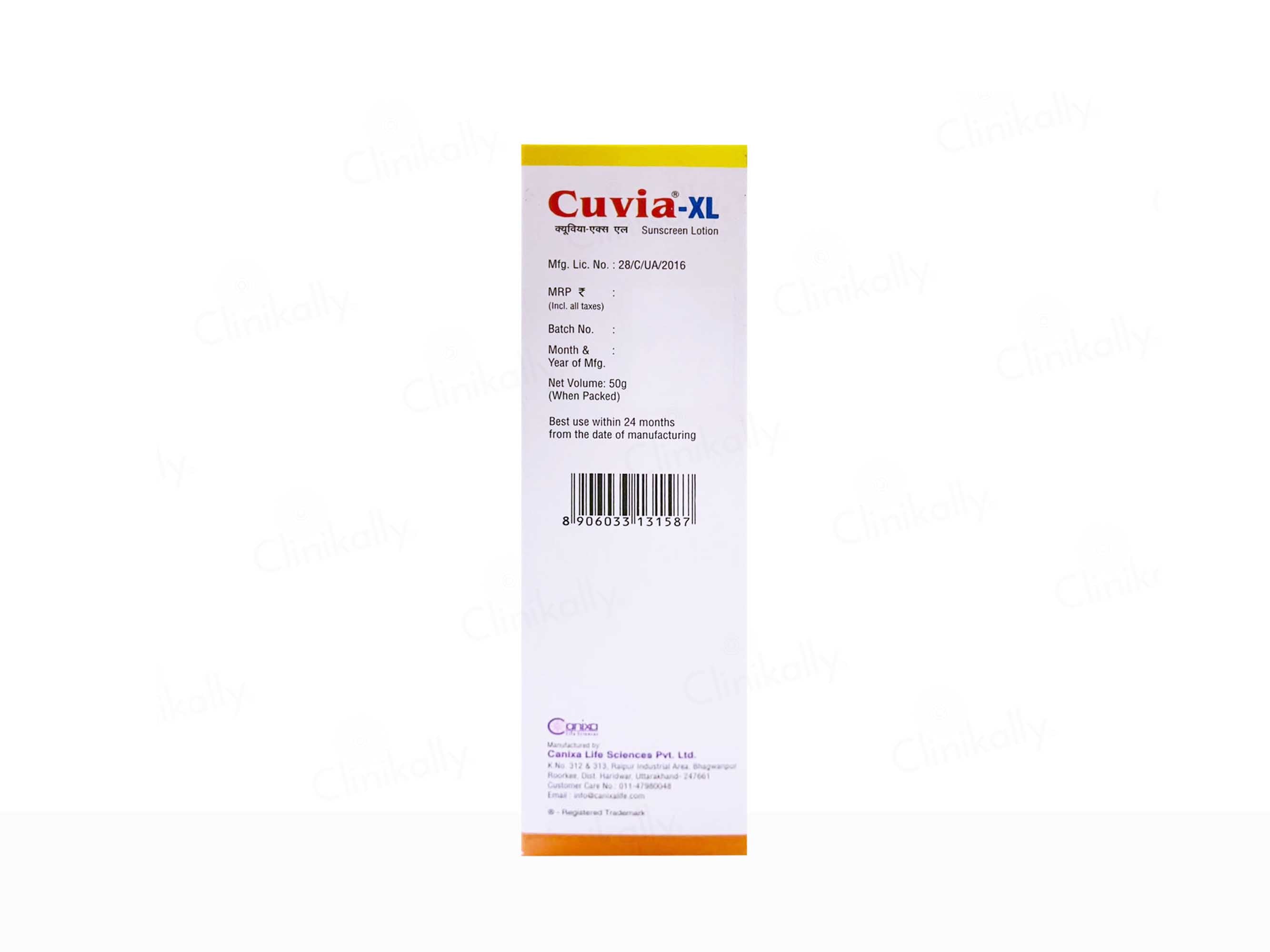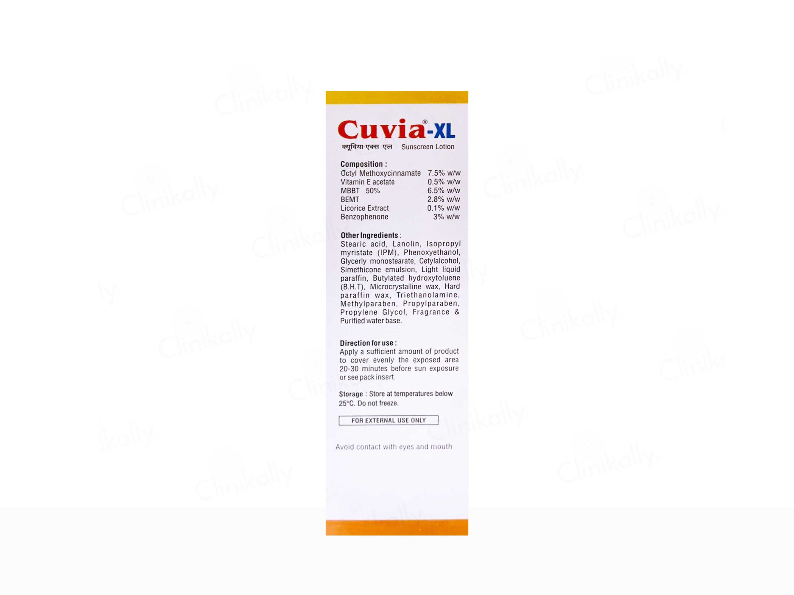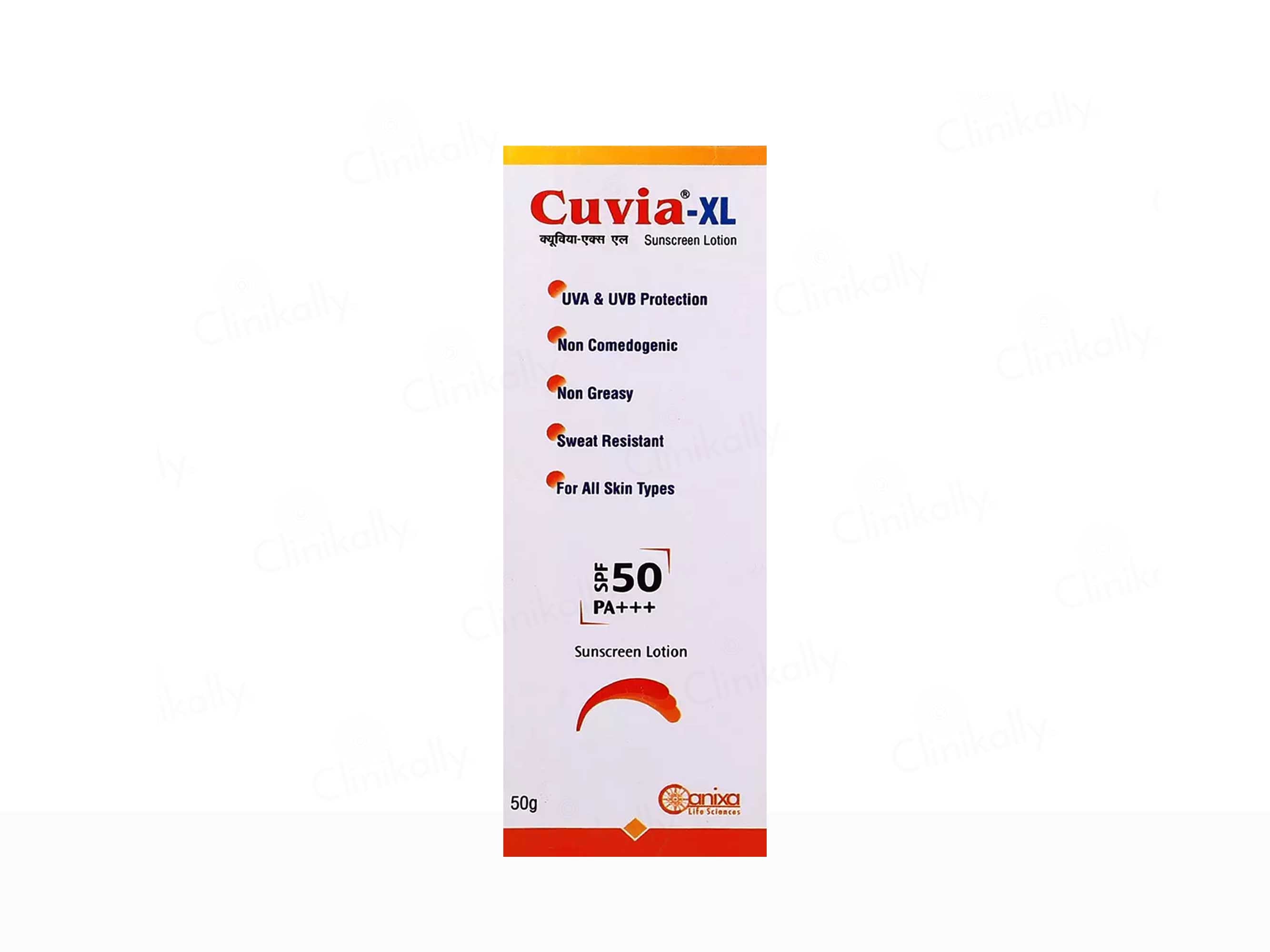 Cuvia-XL Sunscreen Lotion SPF 50 PA+++ is a high-performance sunscreen lotion designed to provide broad-spectrum photo-protection against harmful UVA and UVB rays. It shields the skin while being gentle enough for sensitive skin types. Enriched with licorice extract and vitamin E, it hydrates and soothes the skin, preventing and minimising pigmentation,sunburn and photoaging. Its lightweight, non-greasy formula absorbs quickly, making it suitable for daily use by all skin types and under makeup.