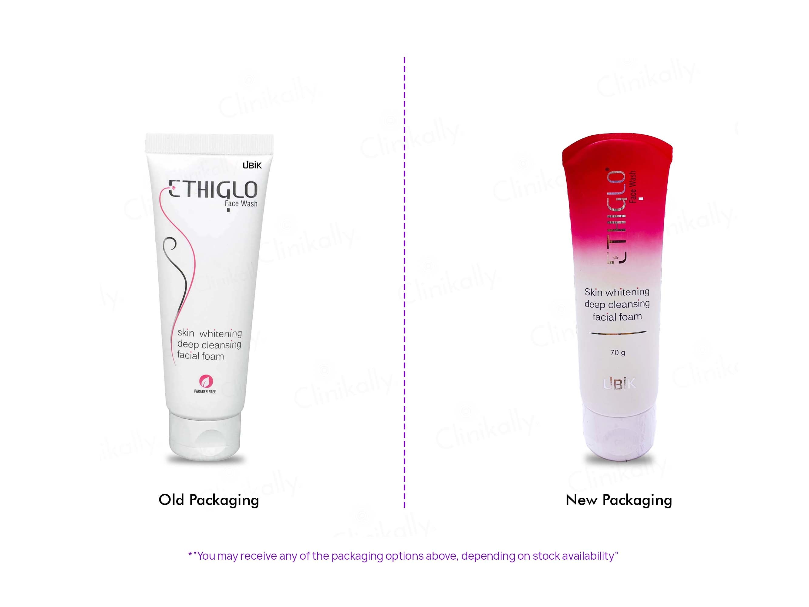 Ethiglo Face Wash contains kojic acid, liquorice extract, AHA/BHA blend, niacinamide, and micro globules.