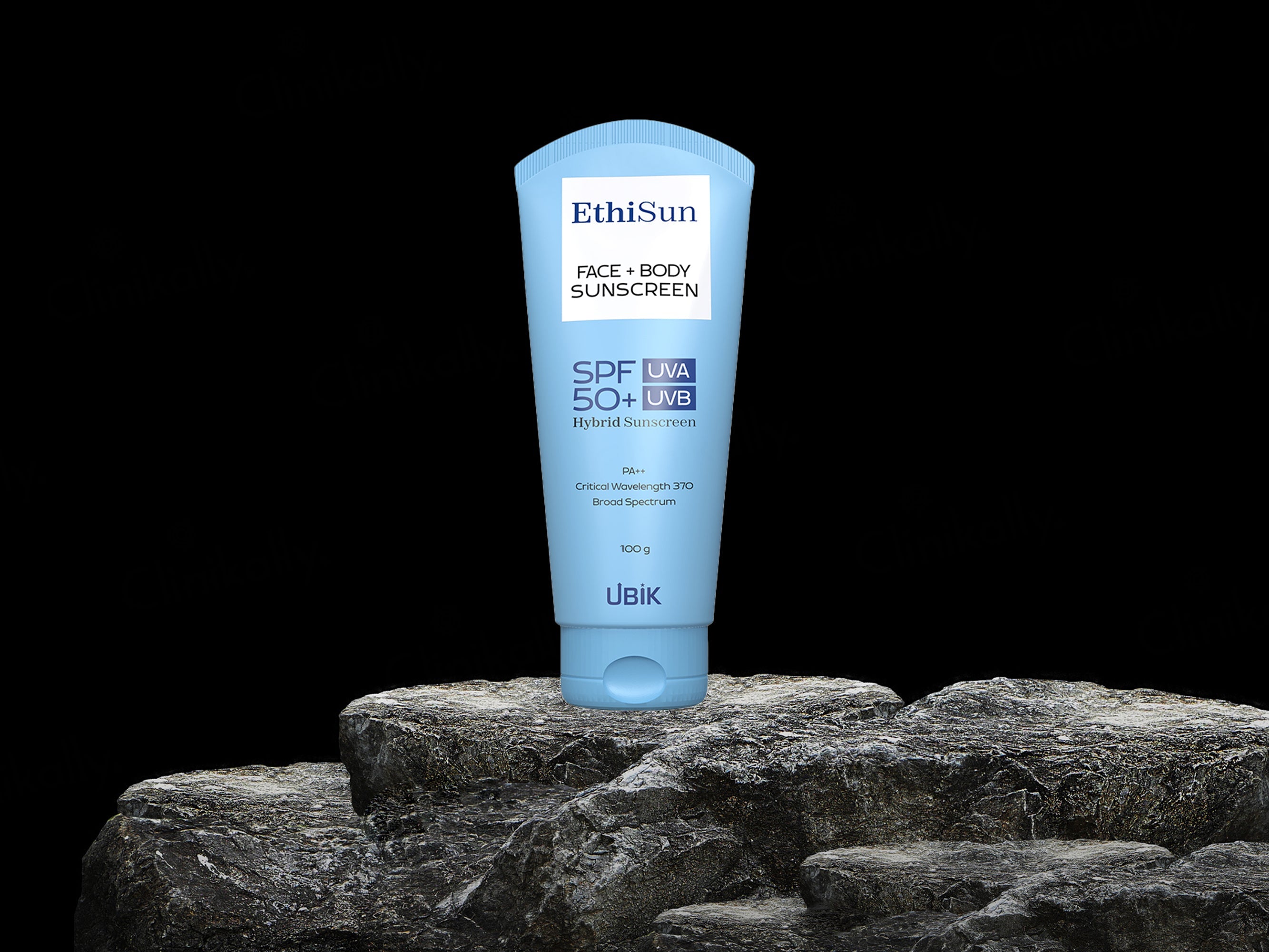 Ethisun Sunscreen SPF 50+ PA++ is a high-performance sunscreen designed to provide broad-spectrum protection against harmful UVA and UVB rays. Formulated with advanced filters like Titanium Oxide and micro-Zinc Oxide; and nourishing ingredients like Vitamin A, Vitamin E, Rosehip Oil and Squalane, this lightweight and non-greasy sunscreen not only protects the skin from sun damage but also hydrates, nourishes and soothes it. Its fast-absorbing formula ensures a comfortable feel without leaving a white cast, making it suitable for daily use on all skin types, including sensitive skin.