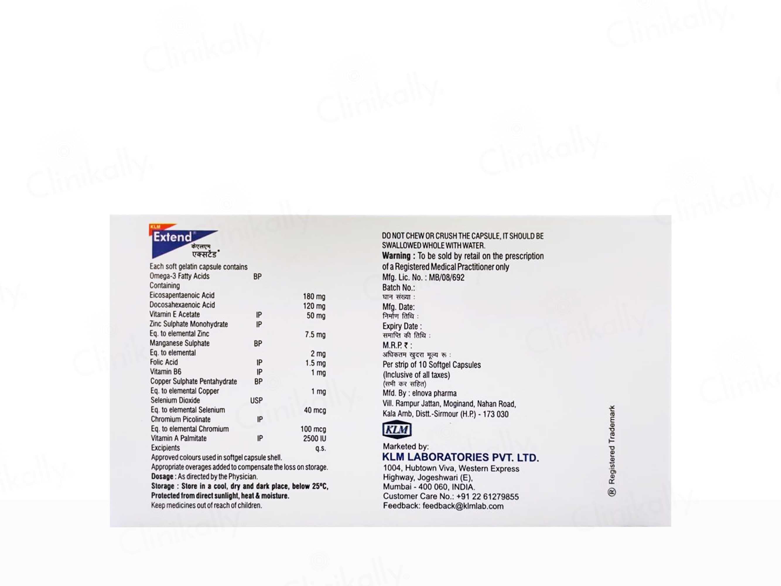 Extend Capsule is a comprehensive supplement containing essential multivitamins, minerals, and antioxidants. Formulated to support overall health, it helps address nutritional deficiencies during periods like pregnancy, childhood, or illness. The blend of vitamins and minerals promotes energy, immunity, and liver function, while antioxidants protect the body from oxidative damage. Ideal for those seeking to maintain balanced nutrition and enhance their well-being.