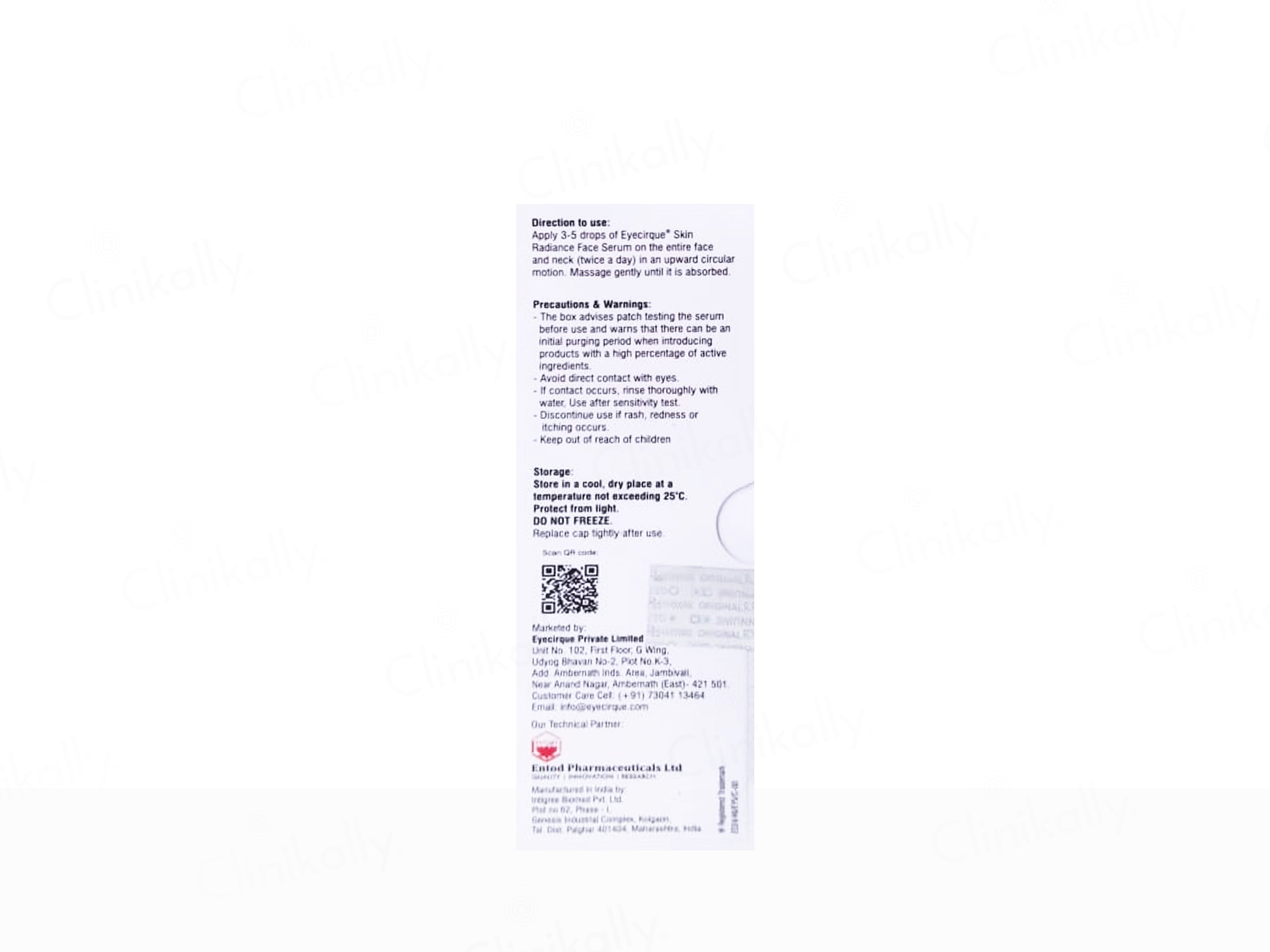 Eyecirque Skin Radiance Face Serum is a lightweight, dermatologist-tested serum formulated to brighten skin tone, reduce pigmentation, and smooth fine lines. Enriched with 10% stable Vitamin C, 5% Niacinamide, and Hyaluronic Acid, this daily-use serum improves skin texture, boosts collagen, and provides deep hydration for a youthful glow. It helps refine pores, even out complexion, and protect against environmental stress. Suitable for all skin types, its non-comedogenic, oil-free formula absorbs quickly and is ideal for both morning and evening routines.