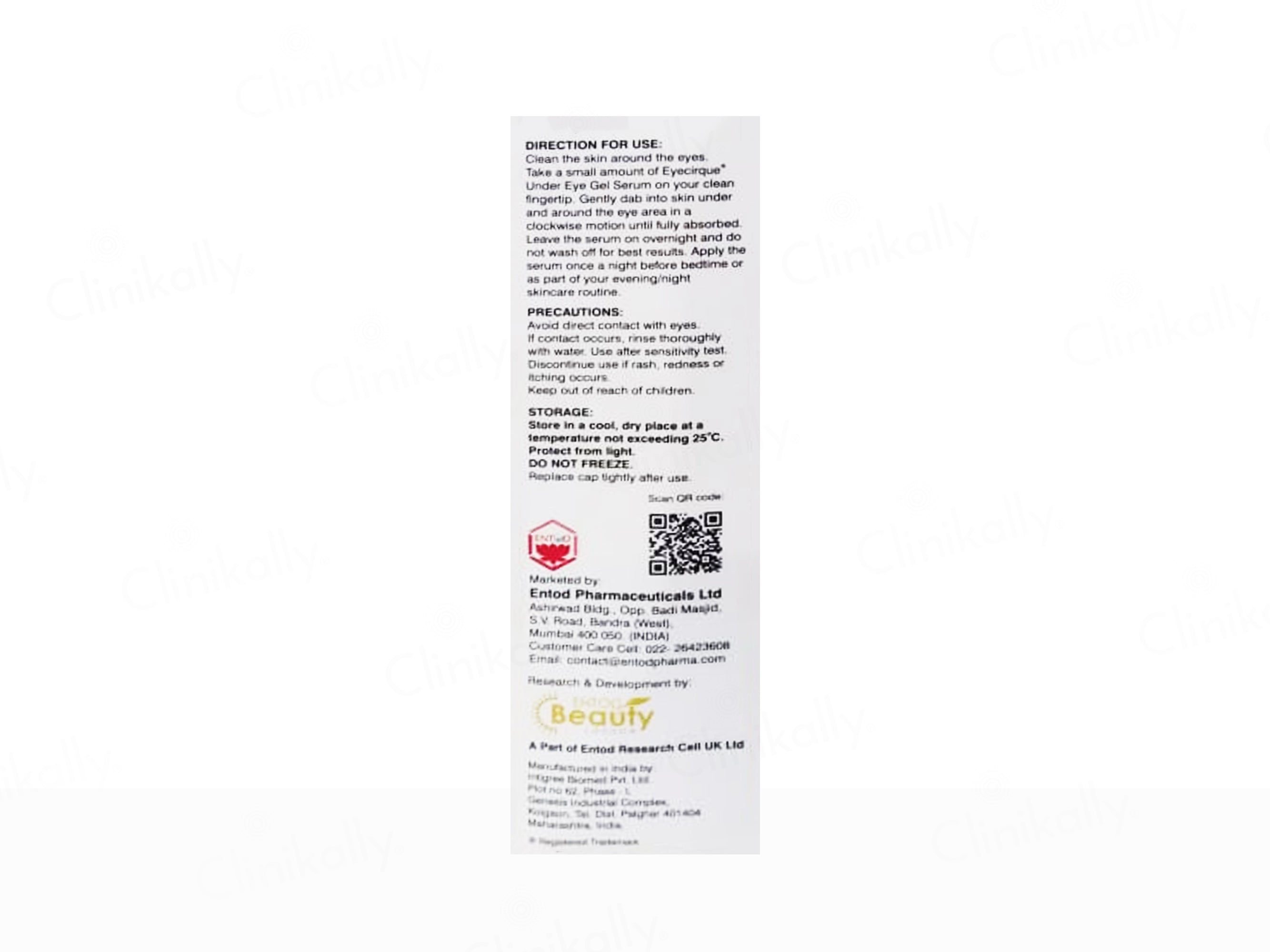 Eyecirque Under Eye Gel Serum is a dermatologist-tested, lightweight nanotechnology formula designed to target under-eye concerns including dark circles, puffiness, eye bags, and fine lines. Enriched with a powerful blend of retinol, niacinamide, glutathione, ginseng extract, and Aquaxyl 3D hydration complex, it visibly firms, brightens, and smoothens the delicate eye area. The serum uses bio-cellular delivery to absorb quickly and hydrate intensely, improving skin tone and reducing signs of fatigue for a refreshed, radiant look. Ideal for all skin types and suited for daily night-time use.