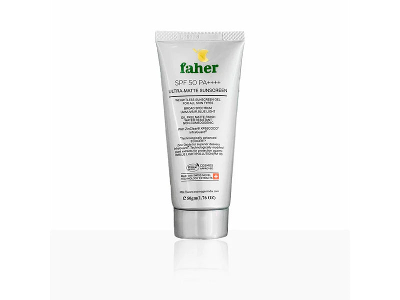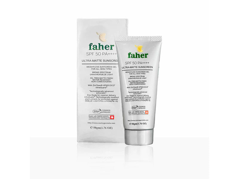 Faher Ultra Matte Sunscreen SPF 50 PA+++ is a broad-spectrum sunscreen providing protection against UVA, UVB, IR, and blue light with a matte, oil-free finish.