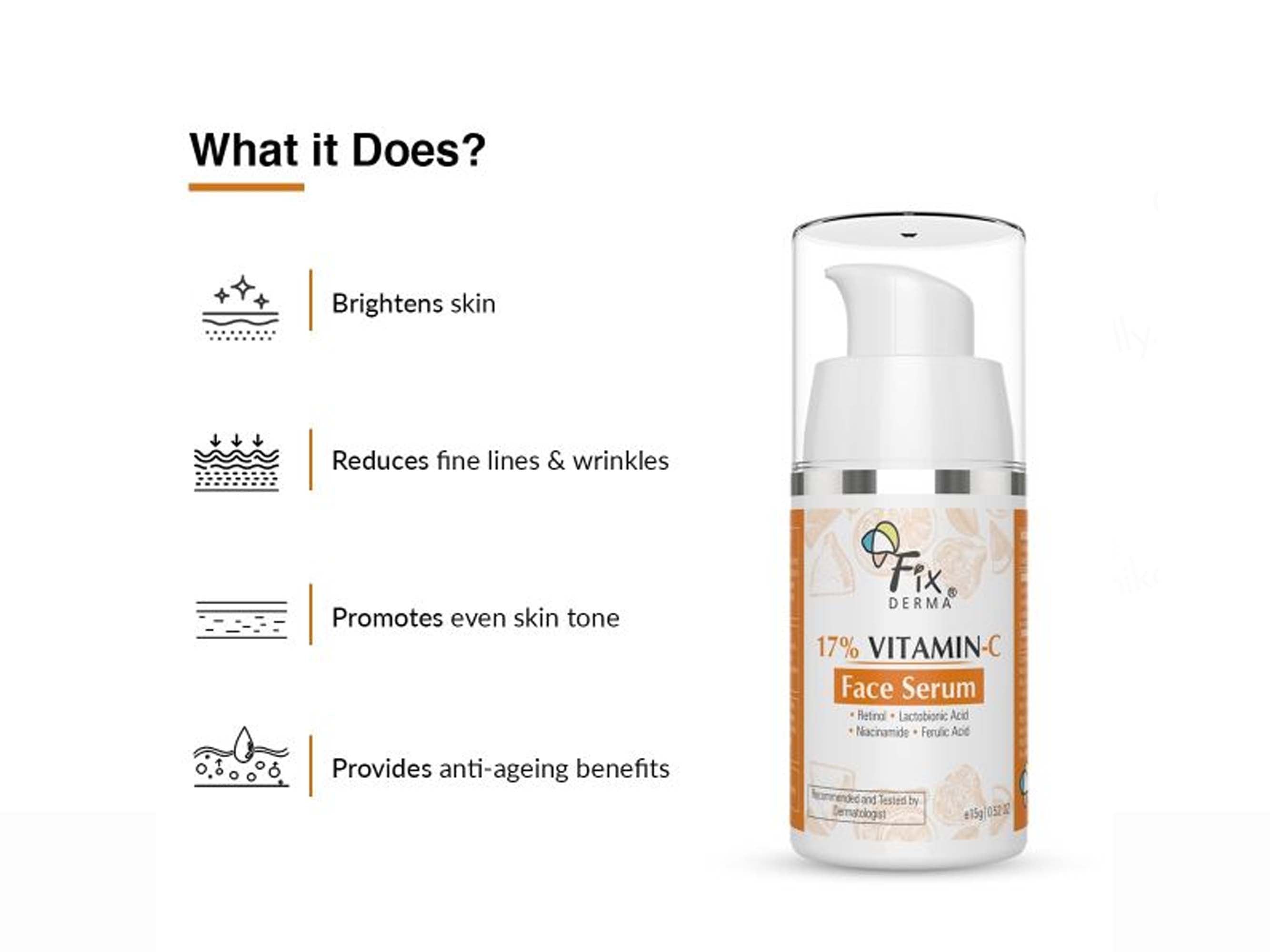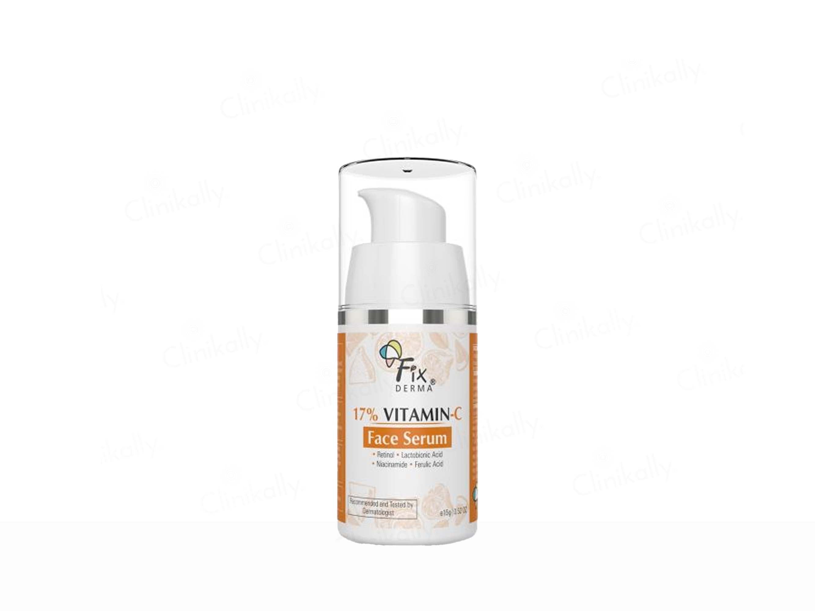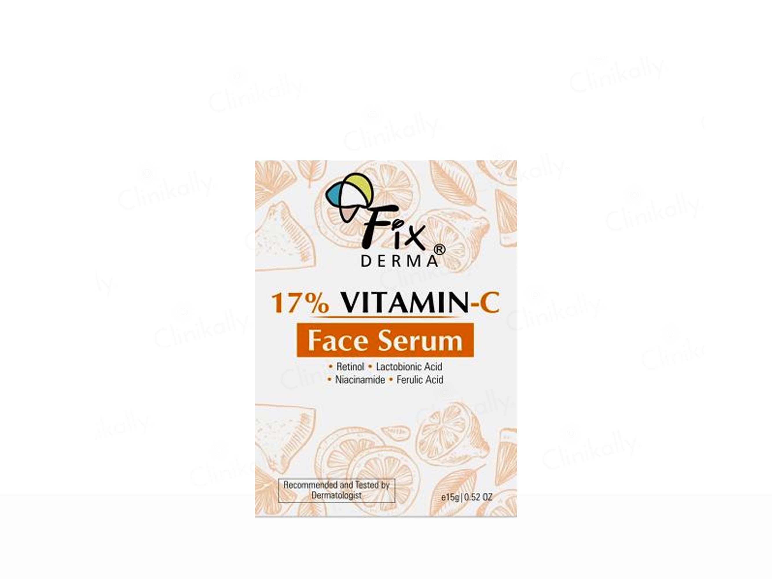 Fixderma 17% Vitamin C Face Serum is a potent antioxidant serum designed to brighten the skin, reduce dark spots, and promote an even skin tone. Infused with 17% pure Vitamin C, this serum helps boost collagen production, protect against environmental damage, and enhance skin radiance. Its lightweight, fast-absorbing formula penetrates deeply into the skin, providing essential hydration and improving overall skin texture. Suitable for all skin types, Fixderma 17% Vitamin C Face Serum is ideal for daily use to achieve a brighter, healthier, and more youthful complexion.