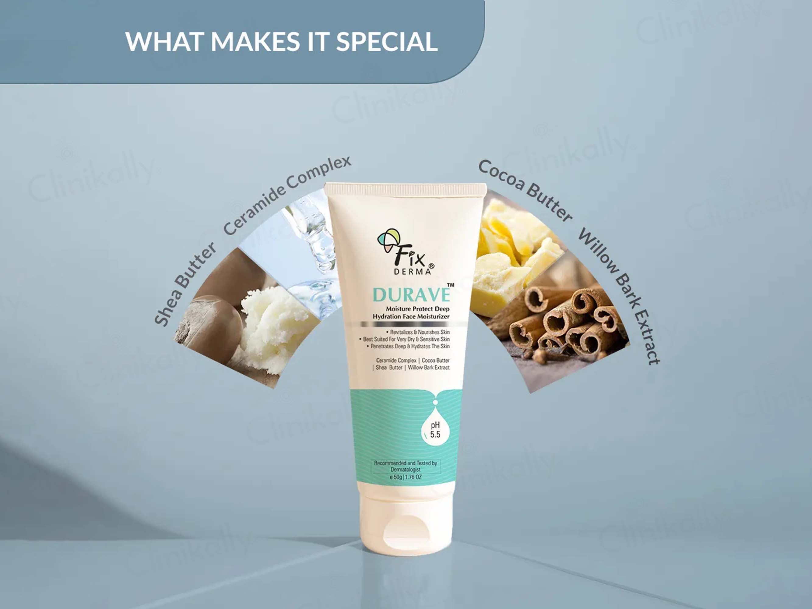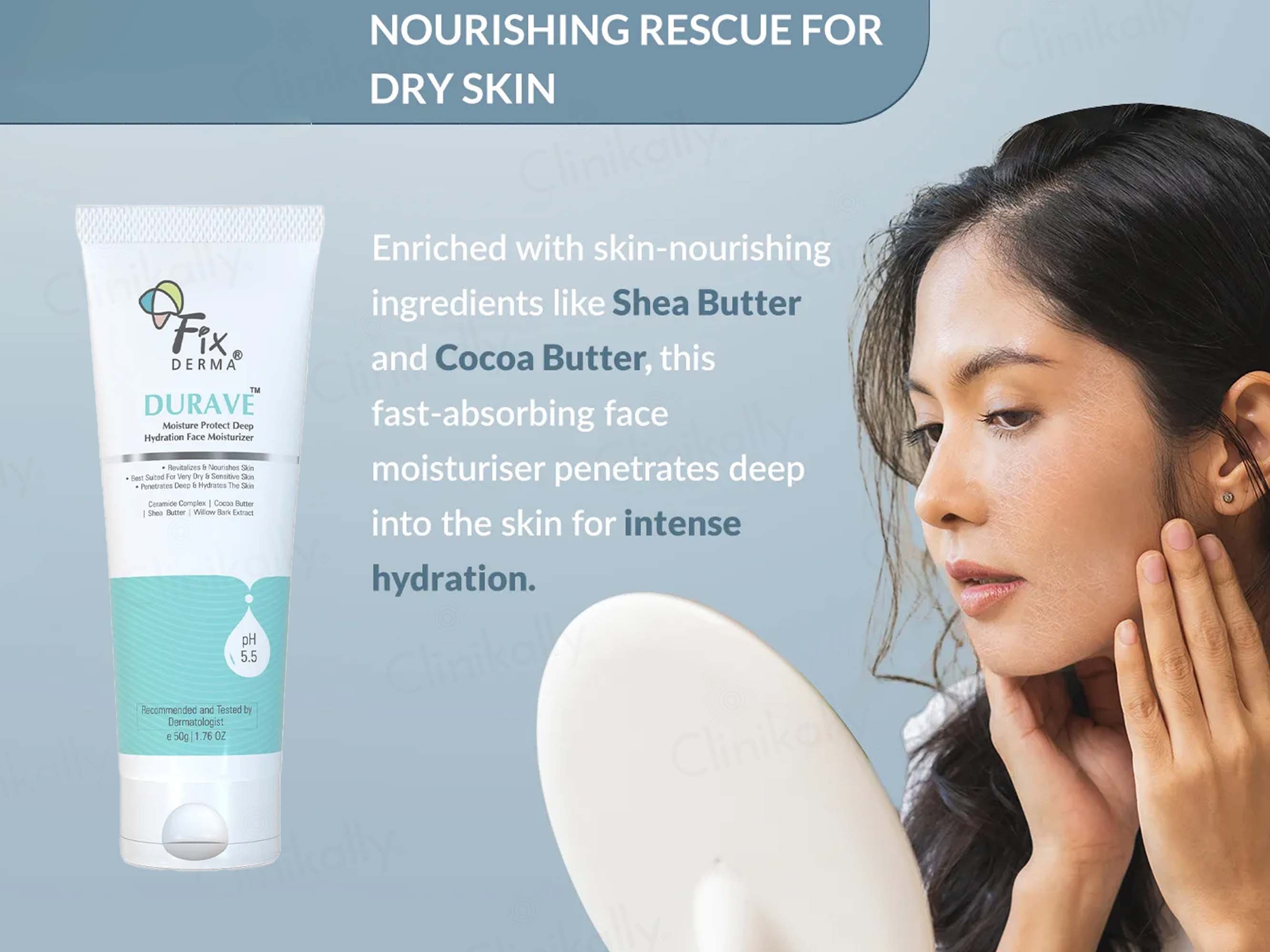 Fixderma Durave Moisture Protect Deep Hydration Face Moisturizer is a non-greasy, lightweight formula designed to provide long-lasting hydration and strengthen the skin's natural barrier. Enriched with Ceramide Complex, Cocoa Butter, Shea Butter, and Willow Bark Extract, it helps replenish moisture, protect against environmental stressors, and maintain skin elasticity. Ideal for individuals with dry or sensitive skin, this moisturizer leaves the skin feeling soft, supple, and rejuvenated.