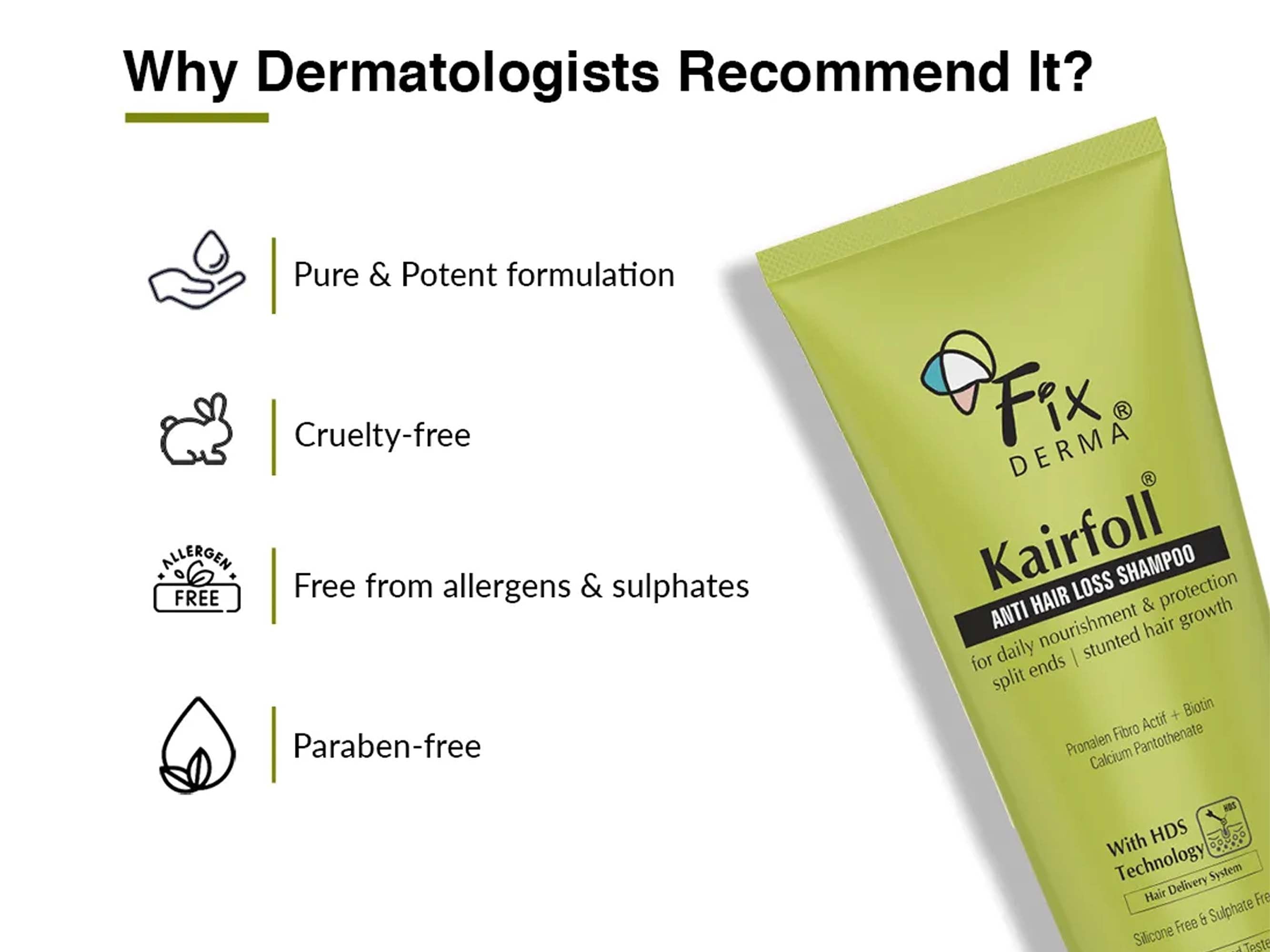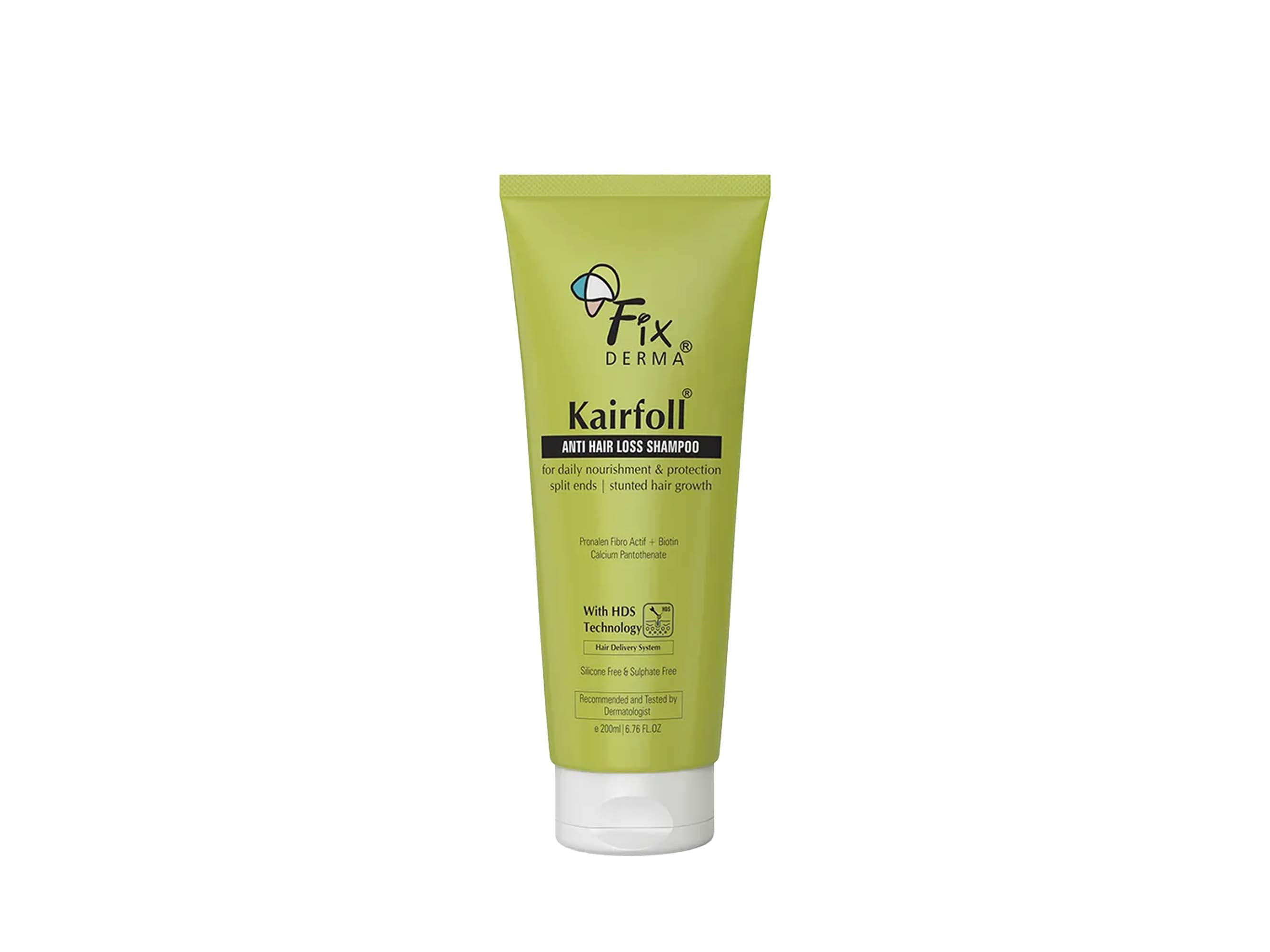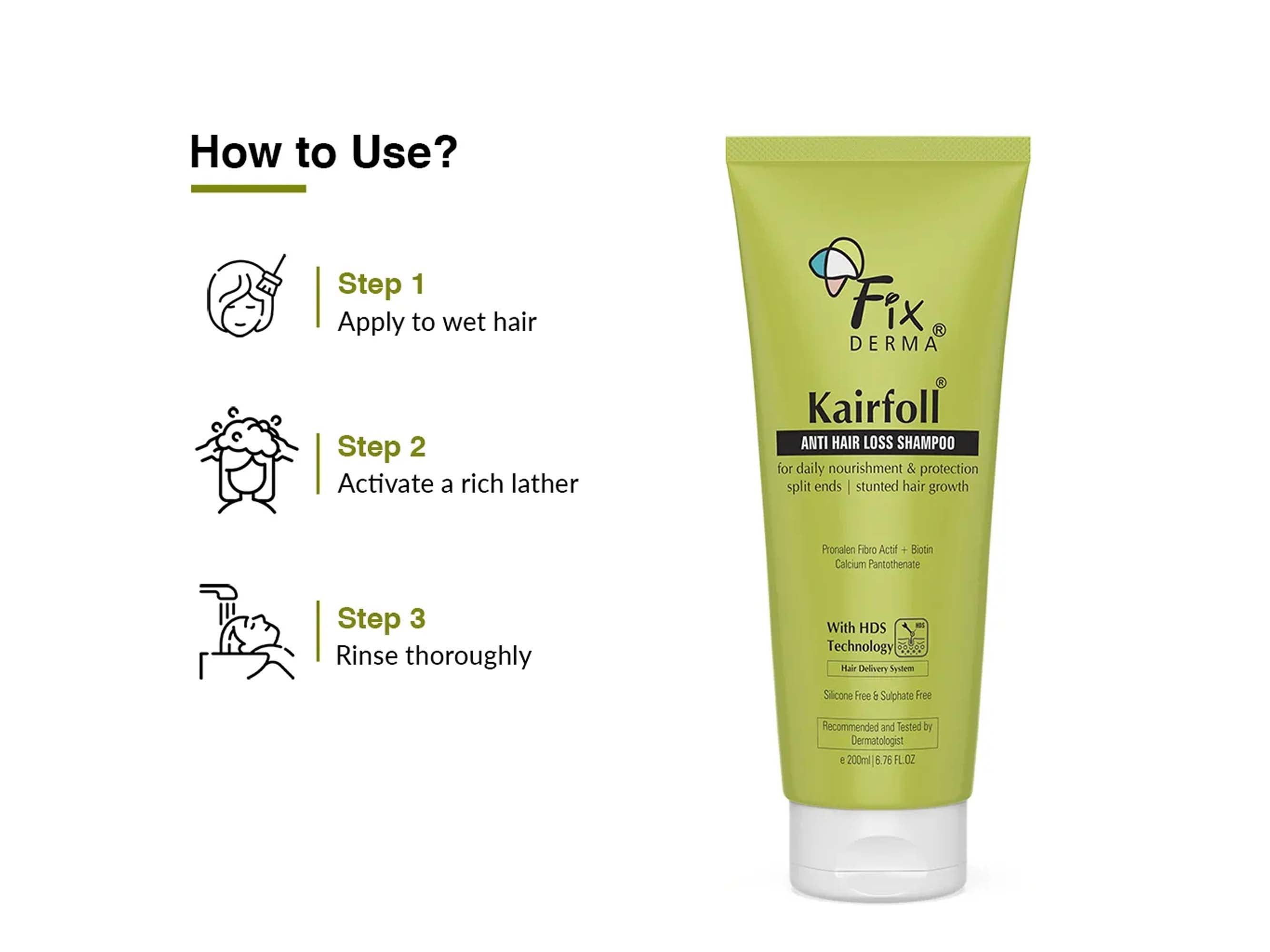 Fixderma Kairfoll Anti Hair Loss Shampoo is a dermatologist-tested formula designed to nourish weak roots and prevent hair fall. Powered by HDS (Hair Delivery System) Technology, it delivers key actives like Pronalen Fibro Actif, Biotin, and Calcium Pantothenate deep into the scalp to stimulate growth and fortify hair structure. This gentle, silicone-free and sulphate-free shampoo targets stunted hair growth, protects against split ends, and supports daily scalp health without irritation. Ideal for regular use, it improves resilience, boosts density, and helps achieve visibly fuller, healthier hair over time.