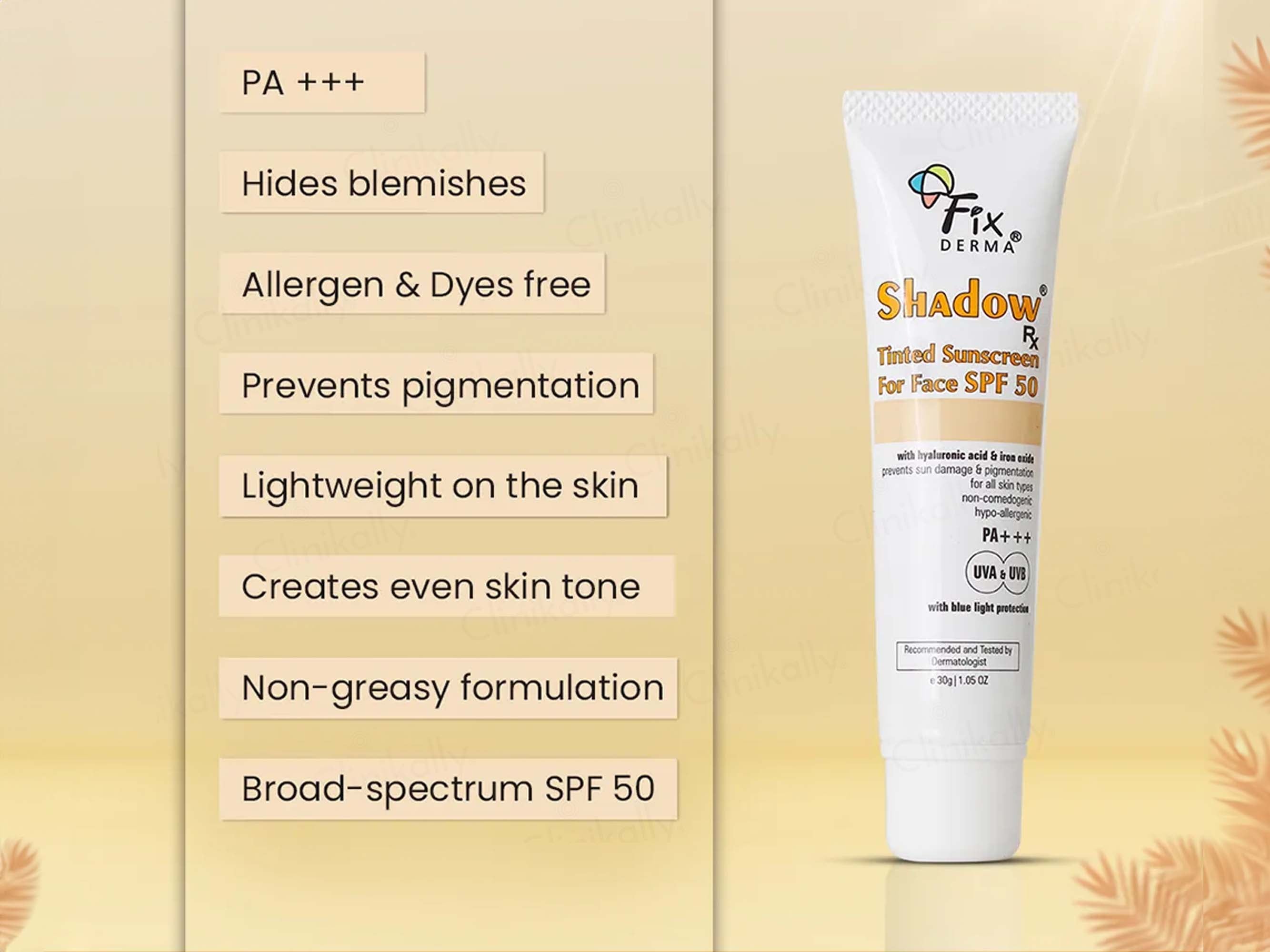 Fixderma Shadow Rx Tinted Sunscreen for Face SPF 50 PA+++ offers advanced sun protection with a touch of color. Designed to shield your skin from harmful UVA and UVB rays, this sunscreen provides high SPF 50 protection while enhancing your complexion with its natural-looking tint. Its lightweight, non-greasy formula blends seamlessly into the skin, reducing the appearance of blemishes, pigmentation and uneven skin tone. Being hypoallergenic, it is ideal for daily use by all skin types. This tinted sunscreen ensures a flawless finish while safeguarding your skin from sun damage.