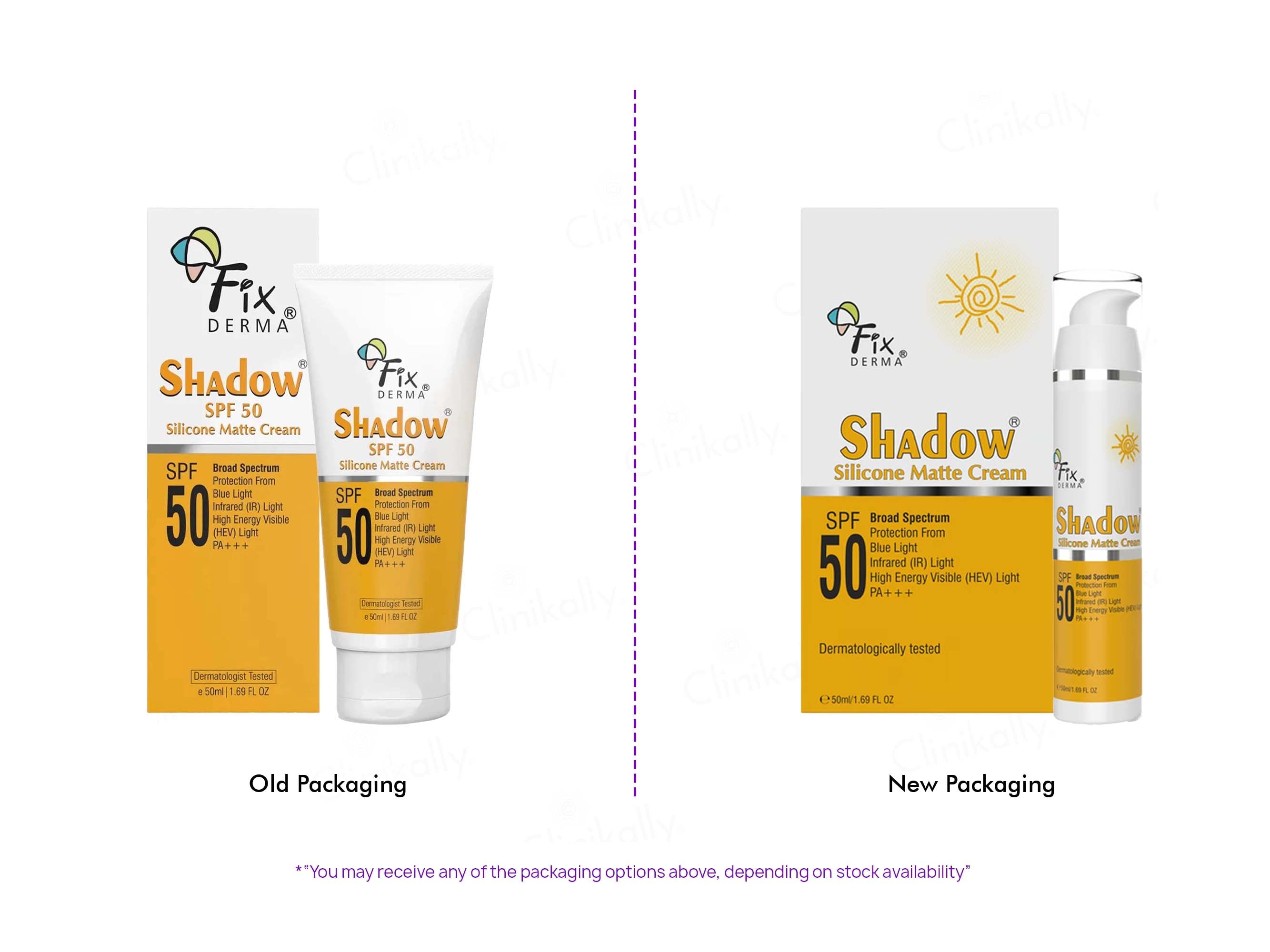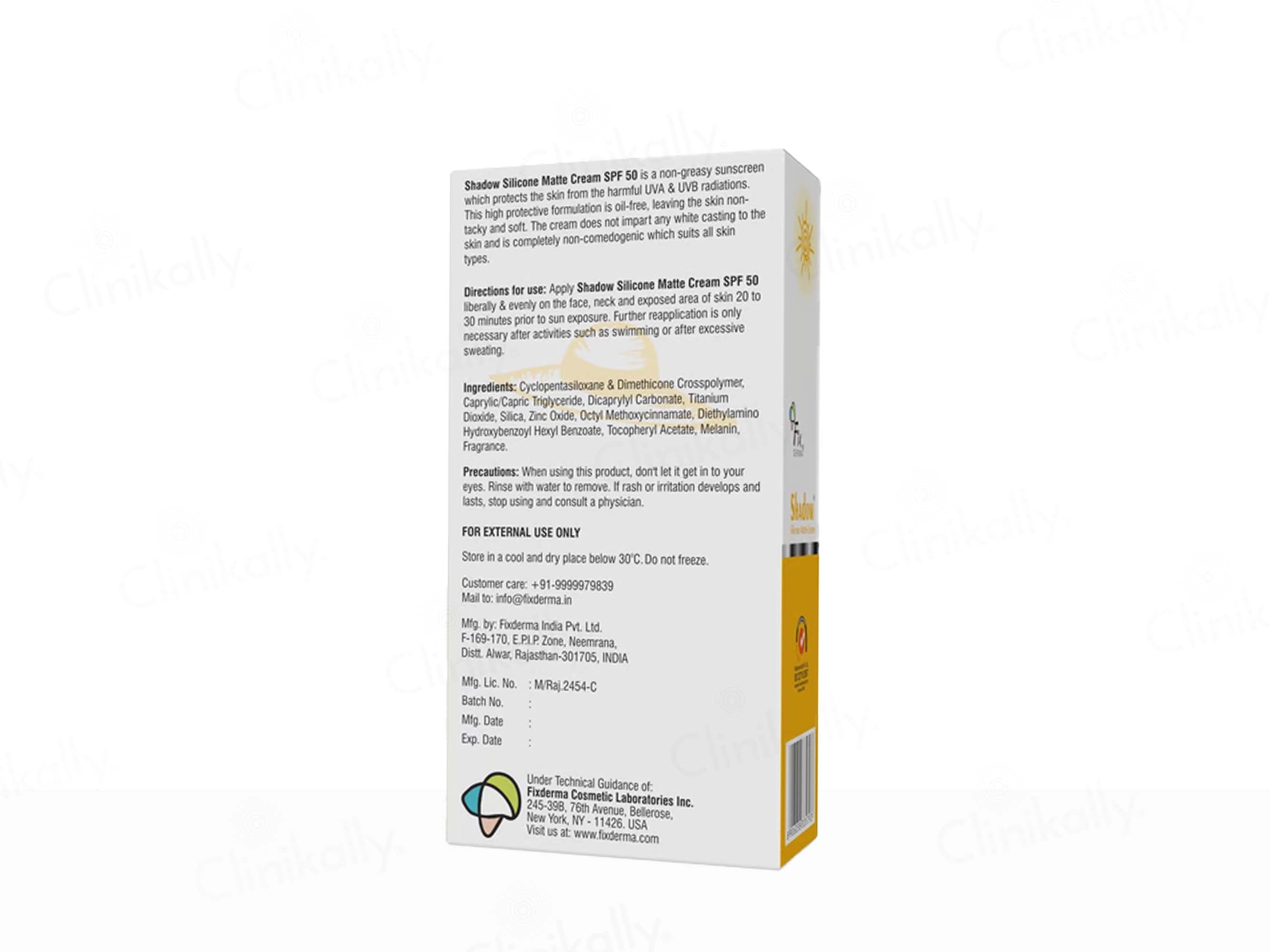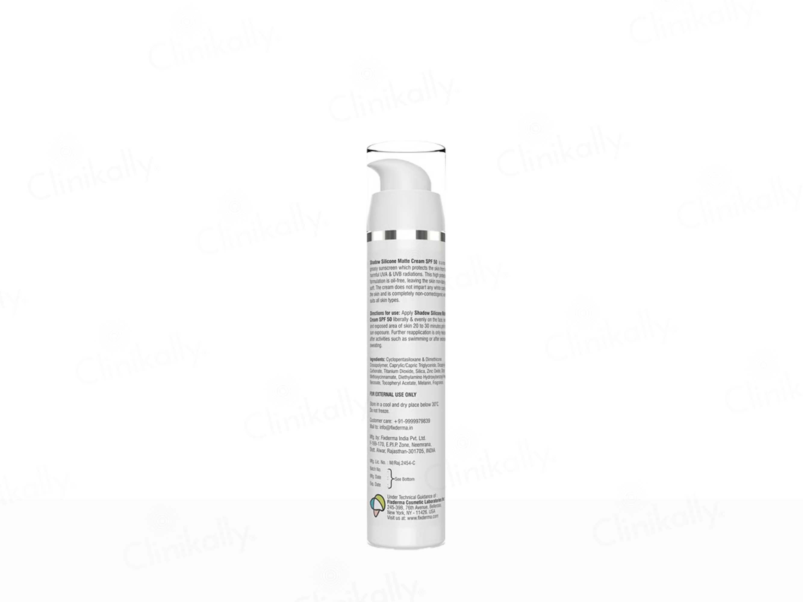 Fixderma Shadow Silicone Matte Cream SPF 50 PA+++ is a high-protection sunscreen designed to shield the skin from harmful UVA and UVB rays. Its advanced silicone-based formula provides a matte finish, ensuring no greasy residue. Being non-comedogenic and enriched with antioxidants and hydrating ingredients, it protects, nourishes, and smoothens the skin. Suitable for all skin types, this sunscreen cream offers broad-spectrum protection while maintaining a white-cast free, lightweight and breathable feel.