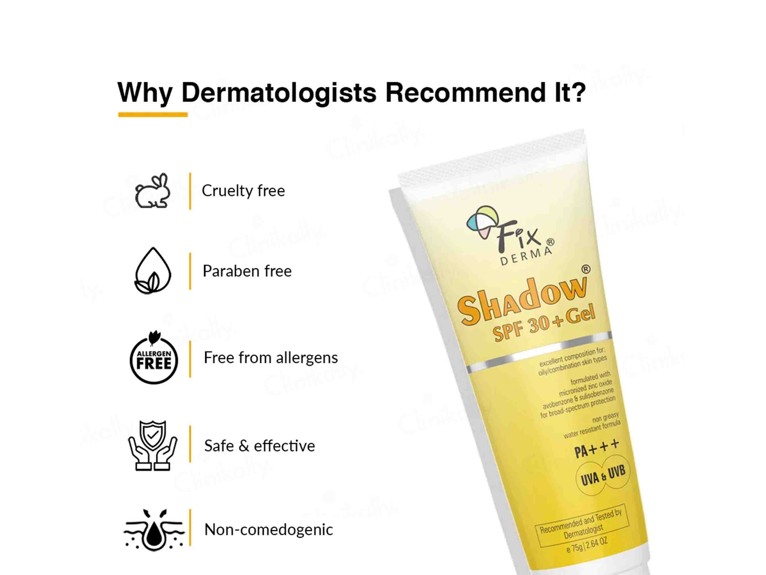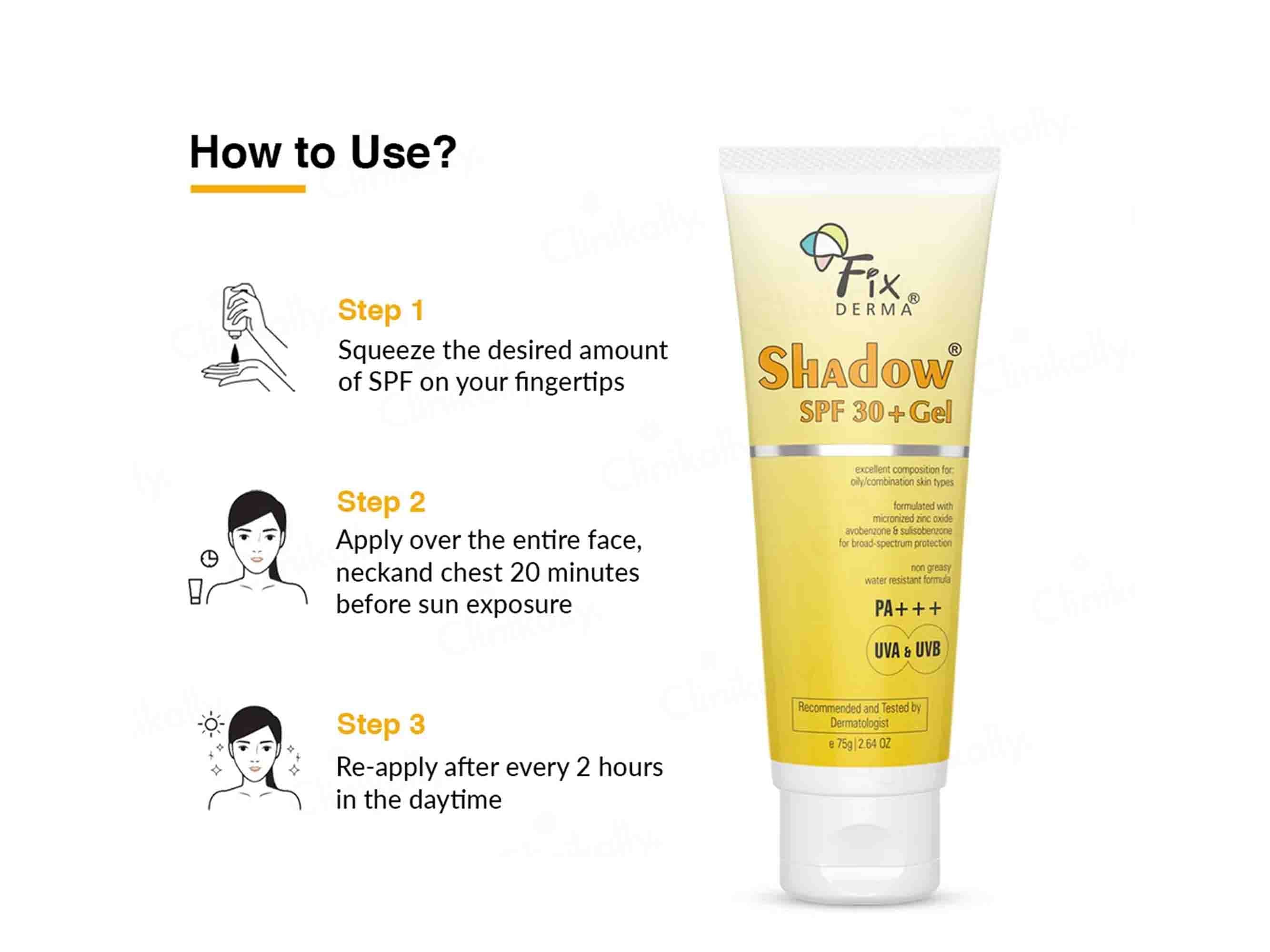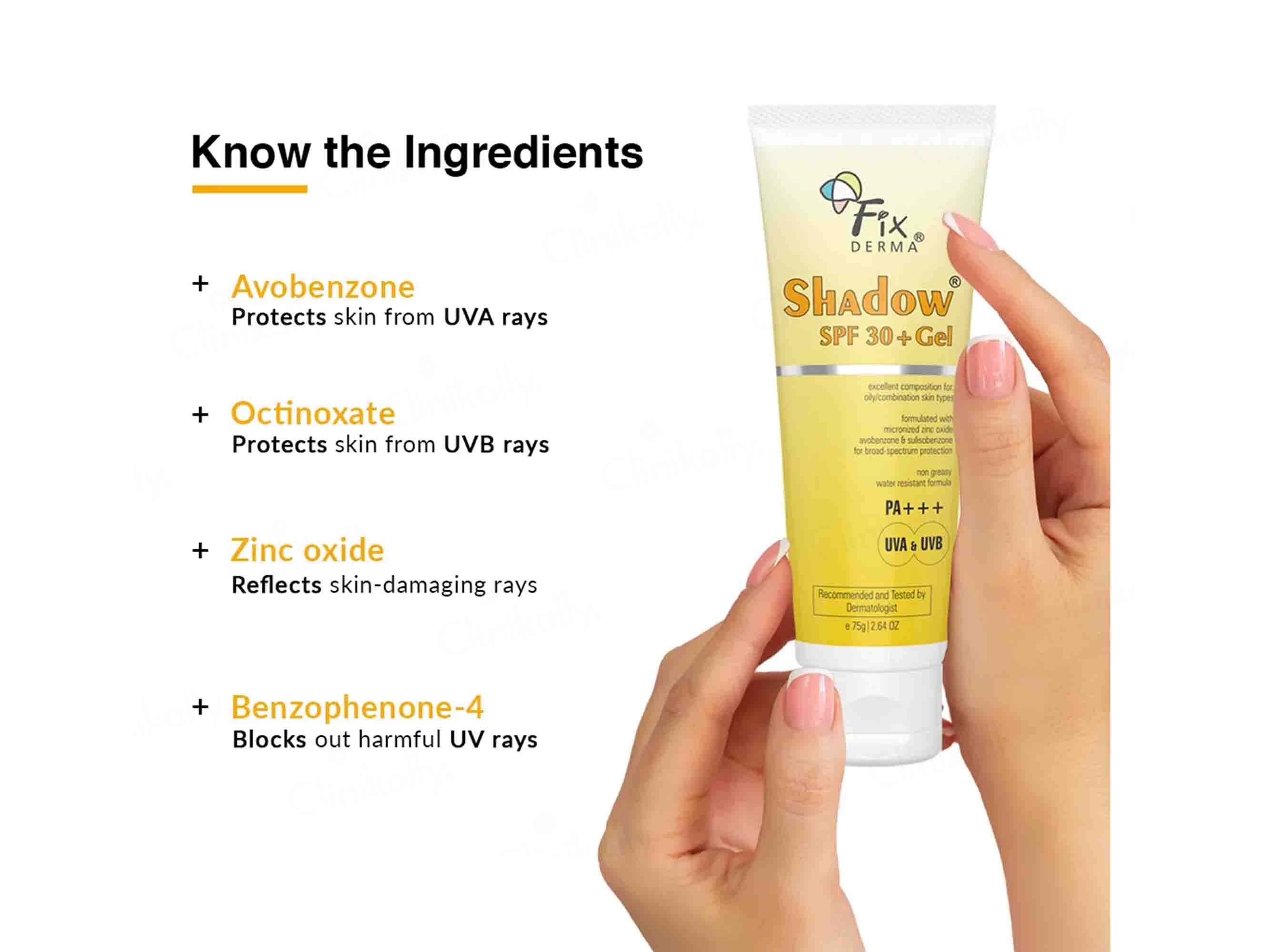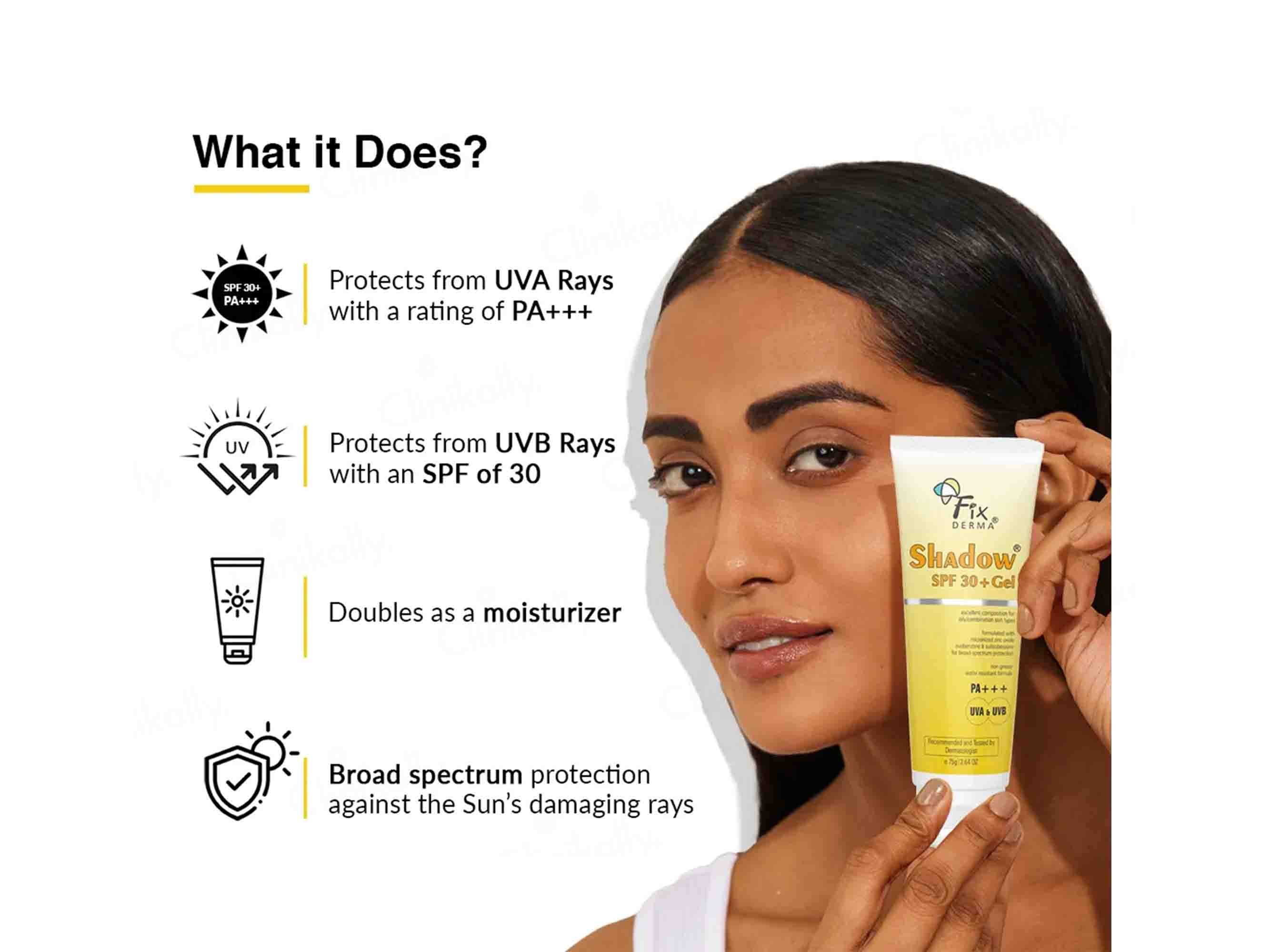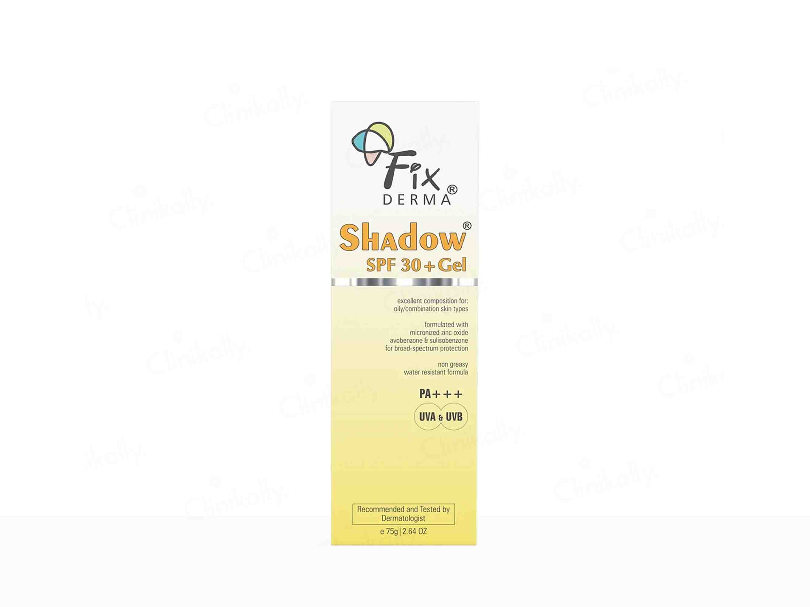 Fixderma Shadow SPF 30+ PA+++ Gel is a lightweight, non-greasy sunscreen designed for oily and combination skin. Its advanced formulation includes micronized zinc oxide, avobenzone, and sulisobenzone, offering broad-spectrum protection against UVA and UVB rays. The water-resistant gel absorbs quickly, ensuring long-lasting defense without a heavy feel. Ideal for daily wear, it shields the skin from sun damage while keeping it fresh and shine-free. Fixderma Shadow SPF 30+ PA+++ Gel also helps prevent tanning and premature aging caused by sun exposure. Its smooth, non-comedogenic texture makes it perfect for daily use under makeup or alone.