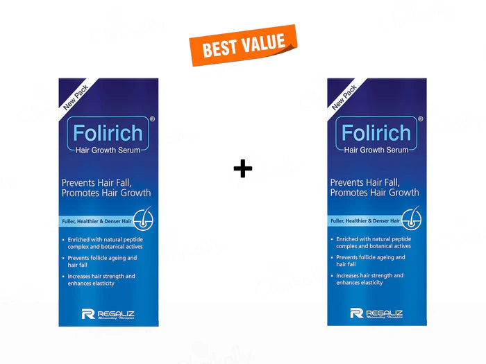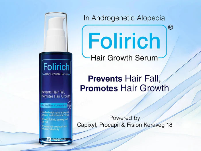 Folirich Hair Growth Serum is a hair serum enriched with natural peptide complex, botanical actives, and amino acids designed to prevent follicle aging, reduce hair fall, and promote fuller, healthier, and denser hair.