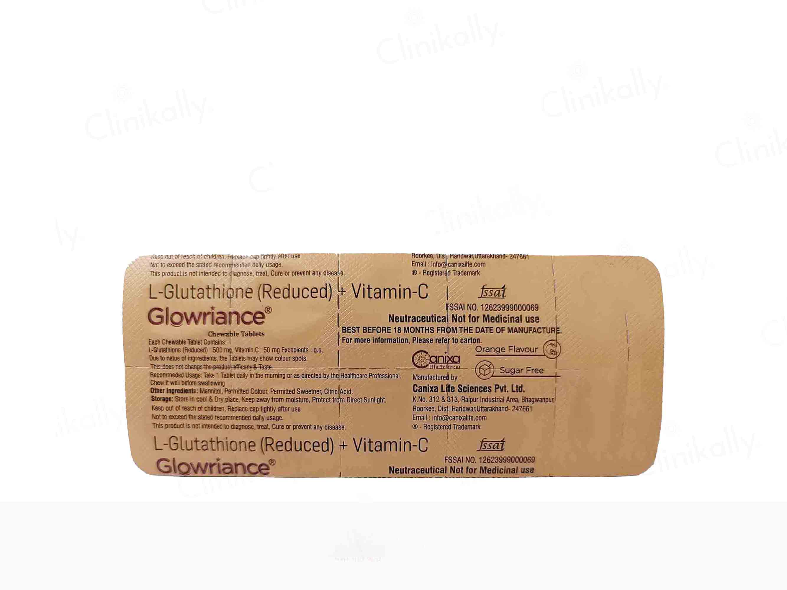 Glowriance Chewable Tablet, in a delightful orange flavor and sugar-free formulation, offer a convenient way to support your skin's health from within. Packed with essential vitamins and antioxidants, these tablets are designed to enhance skin radiance, improve texture, and reduce the appearance of imperfections. Ideal for those seeking a tasty, sugar-free option to incorporate into their daily skincare routine.