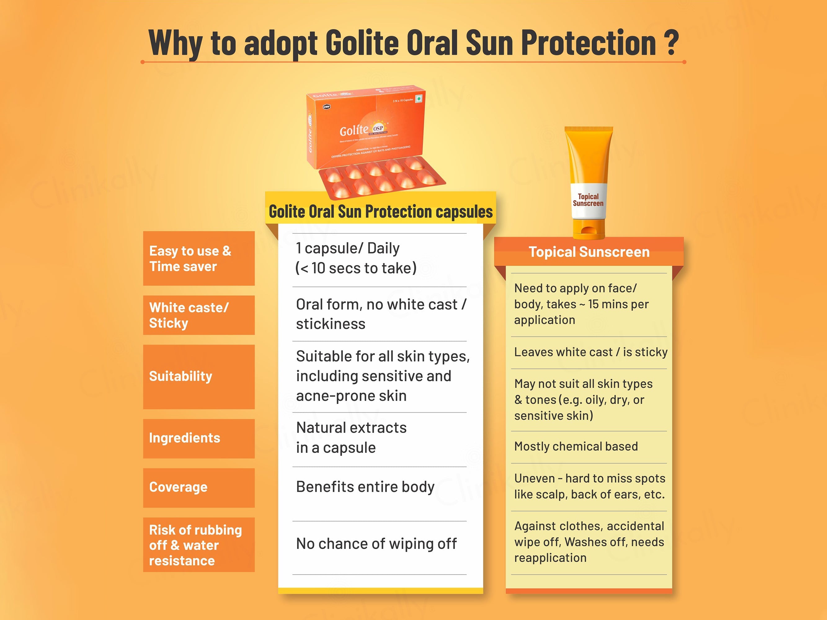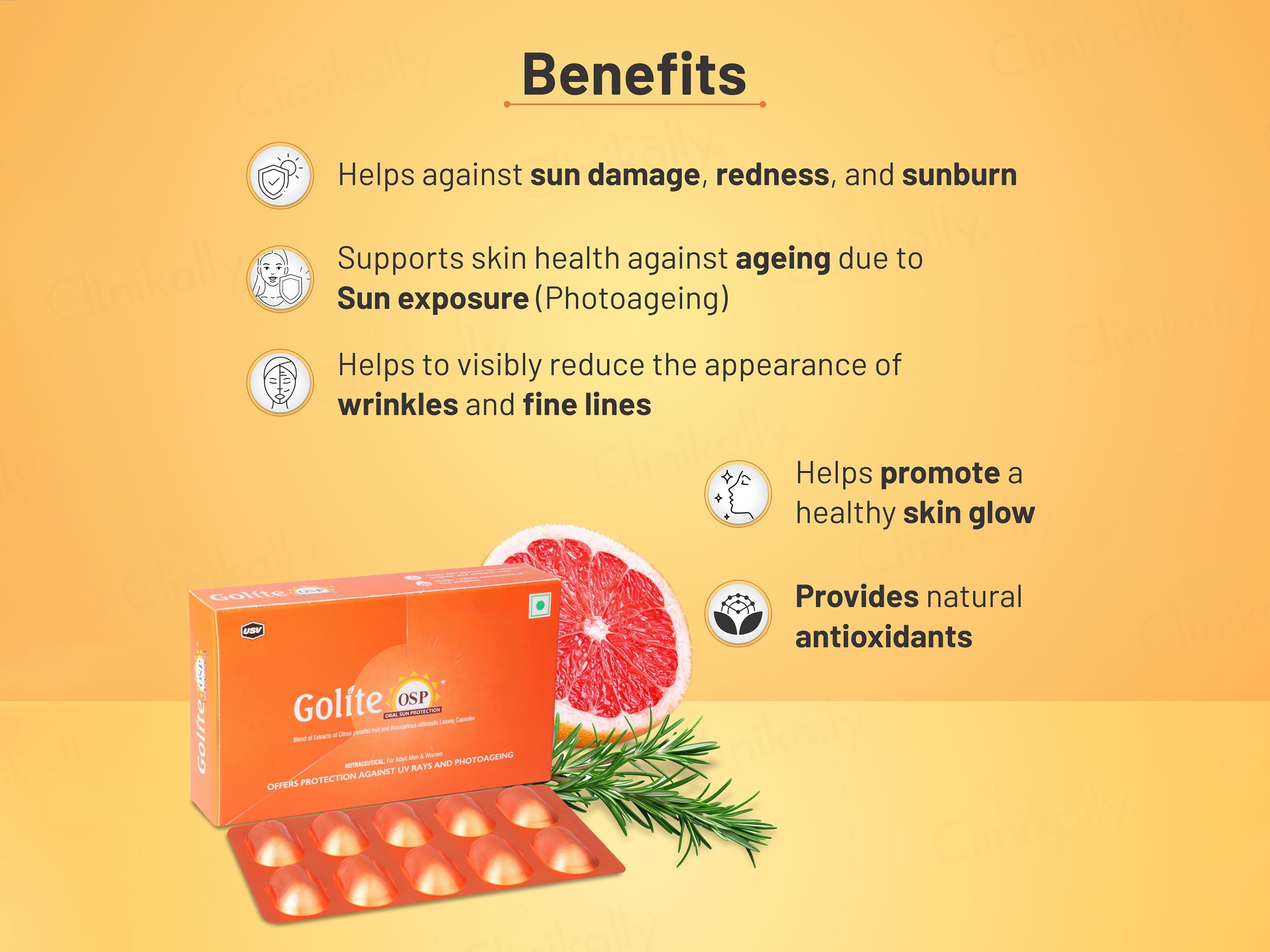 Golite OSP Capsule is a unique formulation enriched with antioxidants that protect the skin from sun damage. It guards against UV rays and photoaging, helping the skin appear less tanned and promoting a brighter, more uniform skin tone. This nutraceutical capsule is suitable for adult men and women.