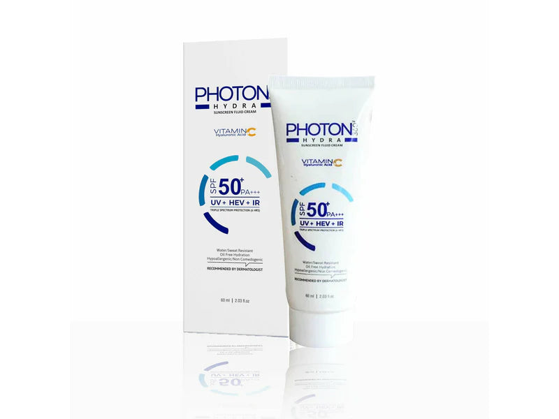 Aclaris Photon 360 Hydra Sunscreen Fluid Cream SPF 50+ provides comprehensive protection against UVA/UVB, High Energy Visible rays, and Infrared rays, and is enriched with antioxidants like Vitamin C and Hyaluronic Acid for long-lasting defense.