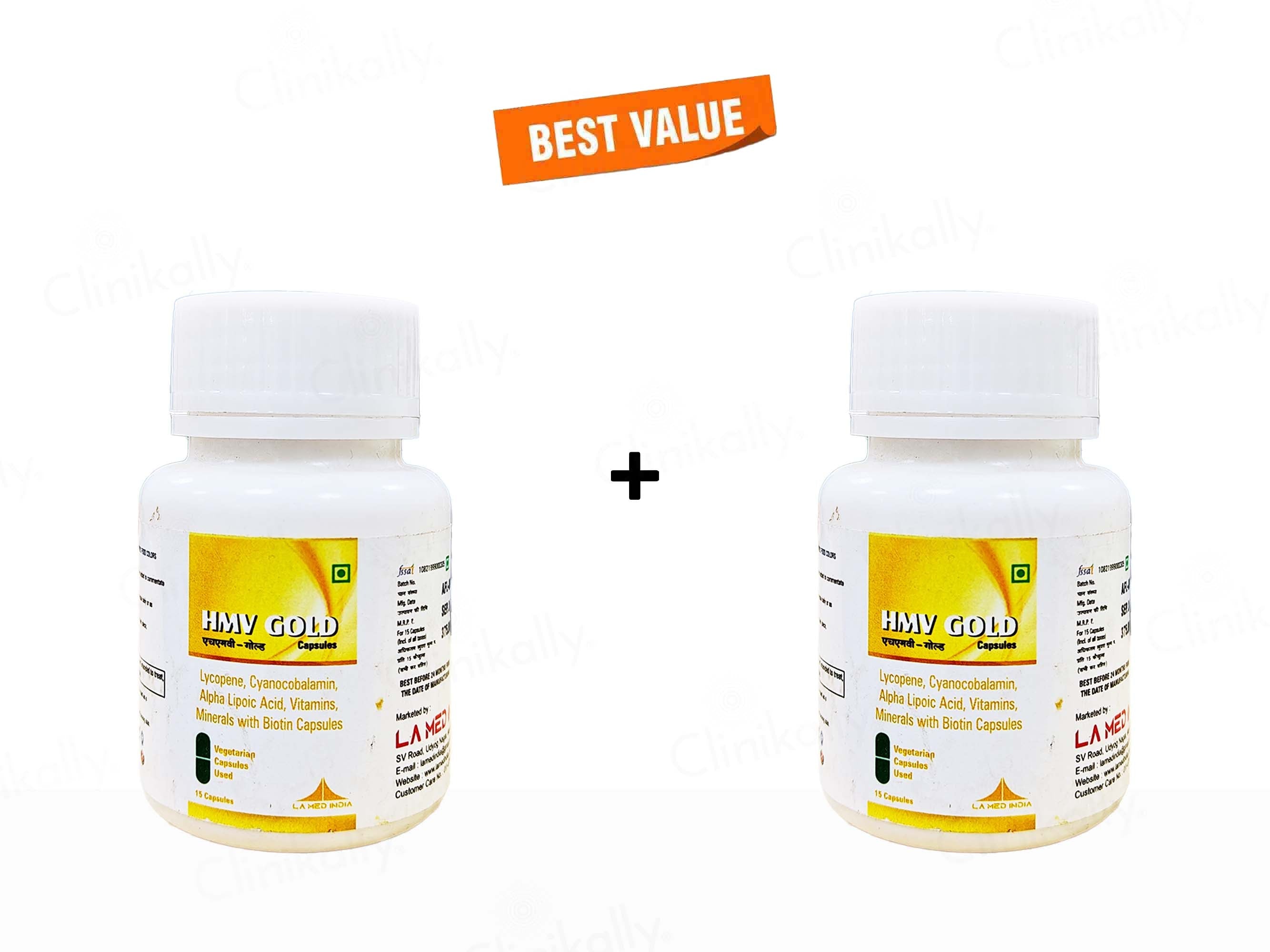 HMV Gold Vegetarian Capsule contains Lycopene, Methylcobalamin, Alpha Lipoic Acid, Vitamin A, Vitamin E, Biotin, and minerals like Zinc and Selenium.