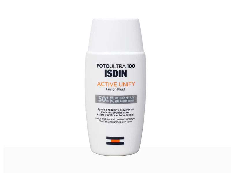 ISDIN FOTOULTRA 100 Active Unify Fusion Fluid SPF 50+ is a high-protection facial sunscreen designed to help unify and brighten skin tone while protecting it from harmful UVA and UVB rays.