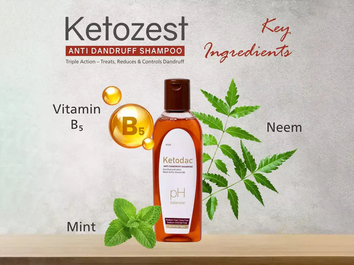 Ketozest pH Balanced Anti Dandruff Shampoo combats dandruff and soothes scalp with Ketoconazole and Tea Tree Oil.