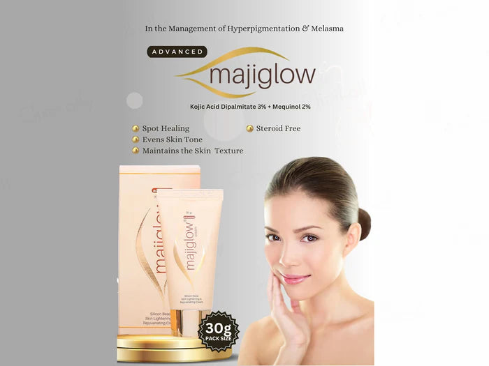 Majiglow Advanced Skin Lightening & Rejuvenating Cream is a silicone-based dermatological formula designed to reduce pigmentation, enhance skin brightness, and rejuvenate dull or uneven skin. Powered by Kojic Acid Dipalmitate, Mequinol, and a blend of emollients and skin conditioners, it improves texture and tone over time. Its non-greasy texture glides smoothly over the skin, making it ideal for daily application on hyperpigmented areas or overall complexion improvement.