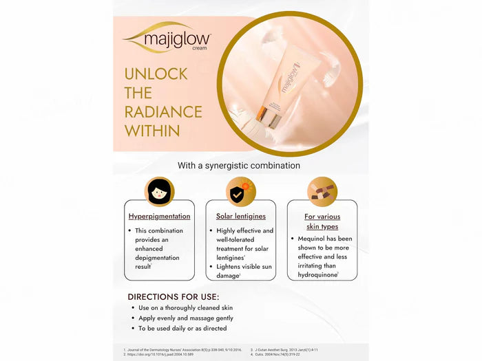 Majiglow is used to reduce pigmentation, brighten the skin, and improve texture with daily application.