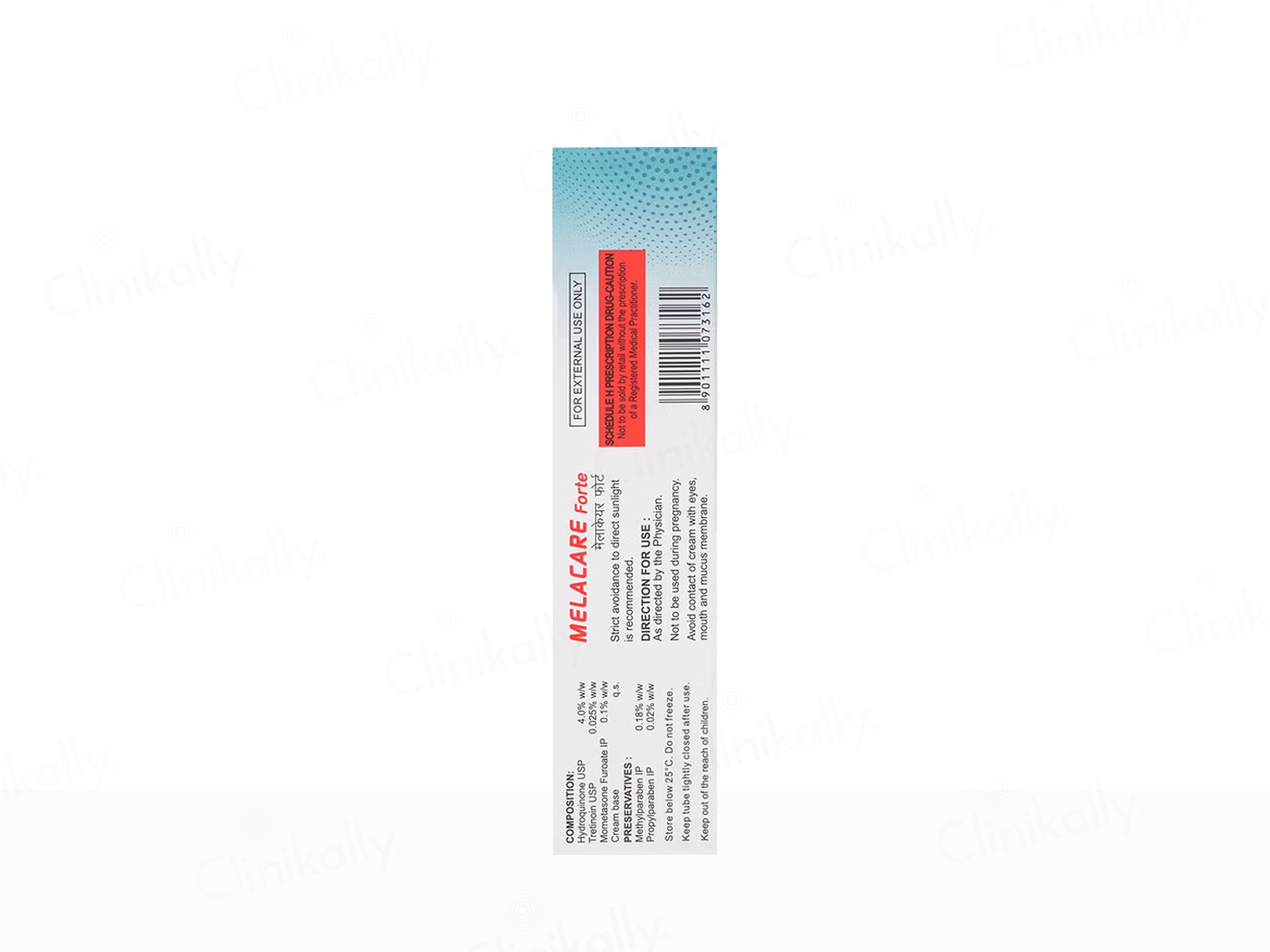 Melacare Forte Cream is a prescription-strength triple combination therapy formulated with Hydroquinone 4%, Tretinoin 0.025%, and Mometasone Furoate 0.1% to effectively treat melasma, hyperpigmentation, and dark spots. Hydroquinone lightens pigmentation, Tretinoin promotes skin cell turnover, and Mometasone Furoate reduces inflammation and redness. This potent blend provides visible results in skin tone correction and texture improvement. Ideal for nighttime use under dermatologist supervision, Melacare Forte should be applied cautiously to avoid overuse or irritation.