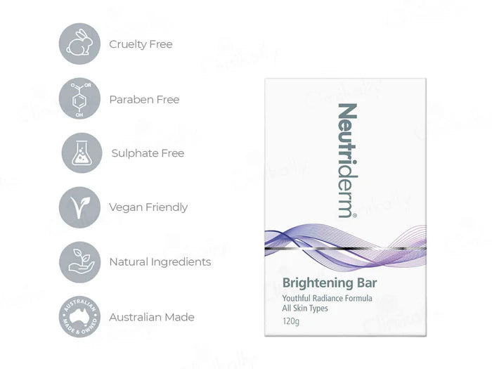 Neutriderm Brightening Bar is a gentle cleansing bar designed to brighten and rejuvenate the skin.