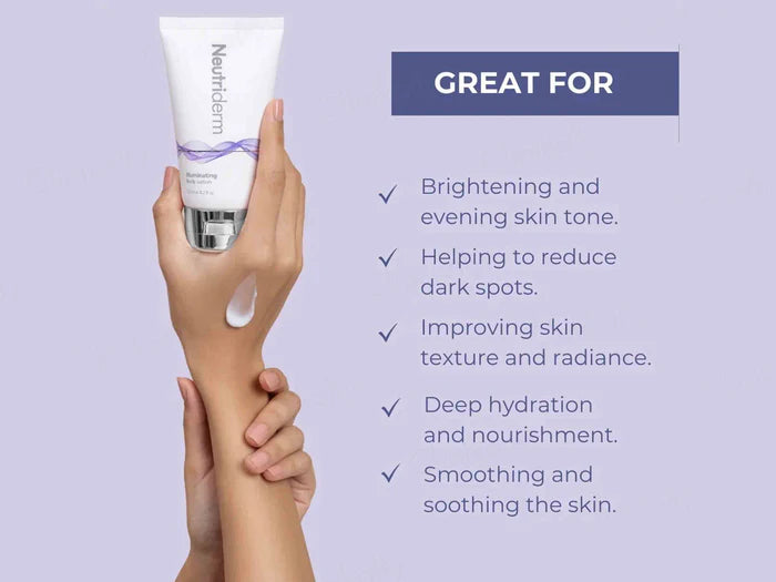 Neutriderm Illuminating Body Lotion is a moisturizer designed to hydrate and enhance the skin's natural radiance.
