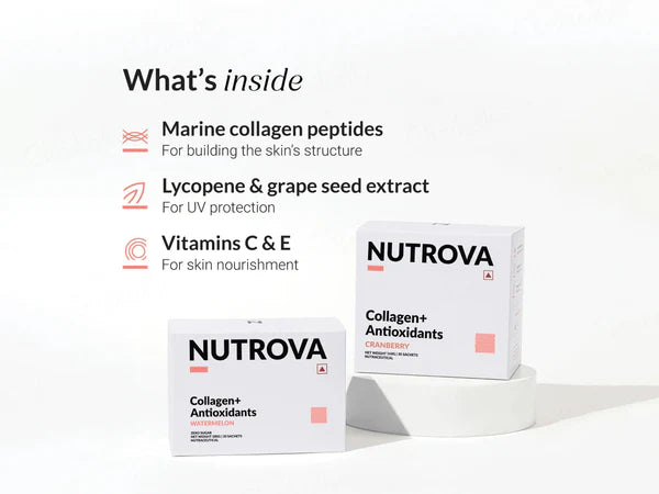 Nutrova Collagen+ Antioxidants increases skin hydration, firmness, and elasticity while reducing dullness, wrinkles, pigmentation, and roughness.