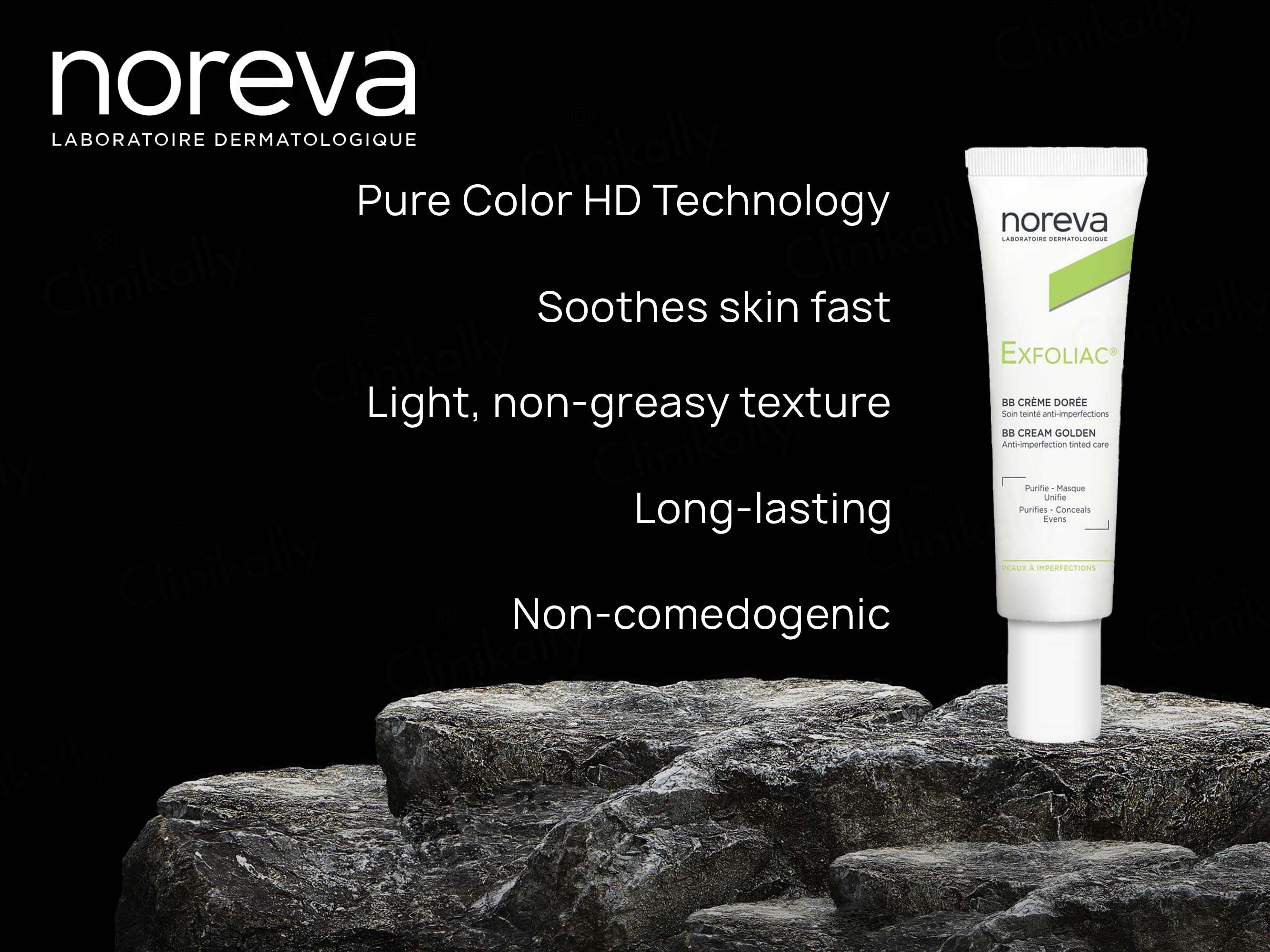 Noreva Exfoliac Actipur BB Anti-Imperfections Tinted Cream – Dorée (Golden) is a multi-functional skincare and makeup hybrid specially formulated for acne-prone and sensitive skin. This non-comedogenic BB cream provides lightweight coverage that conceals imperfections, evens out skin tone, and purifies the skin with its dermatologically tested active ingredients. Designed for daily use, it offers a natural golden tint for a radiant, matte finish while helping reduce blemishes and redness over time. Perfect for oily, blemish-prone skin, it combines the benefits of skincare and makeup for a clearer, more unified complexion.