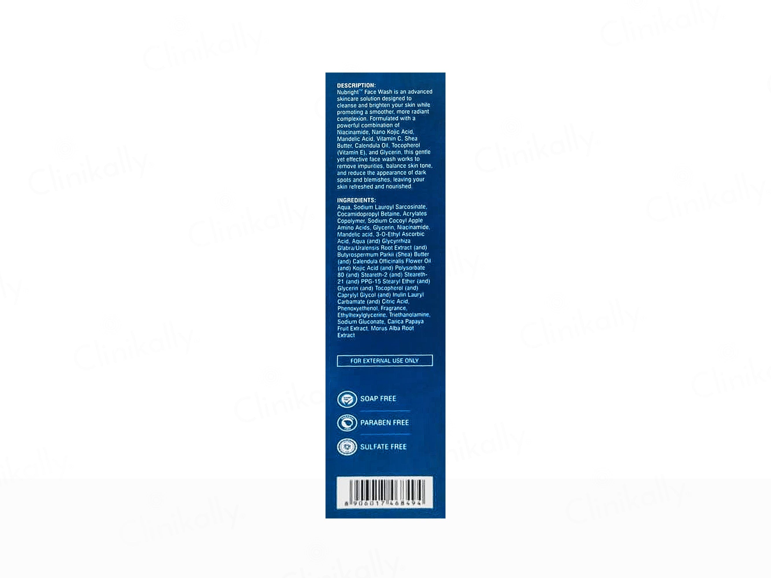 NuBright Gentle Cleansing & Brightening Face Wash is a pH-balanced face wash designed to cleanse and brighten skin while promoting a smoother complexion. Formulated with Niacinamide, Vitamin C, and natural extracts like Calendula Oil and Papaya Extract, it gently removes impurities, balances skin tone, and leaves skin refreshed and nourished. Suitable for all skin types and daily use.