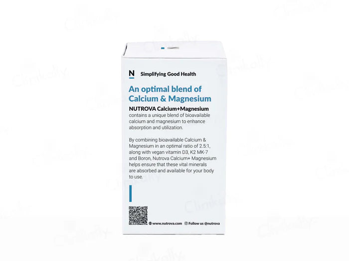 Nutrova Calcium + Magnesium Health Supplement Tablet is used to support bone health, muscle function, and improve overall mineral absorption in the body.