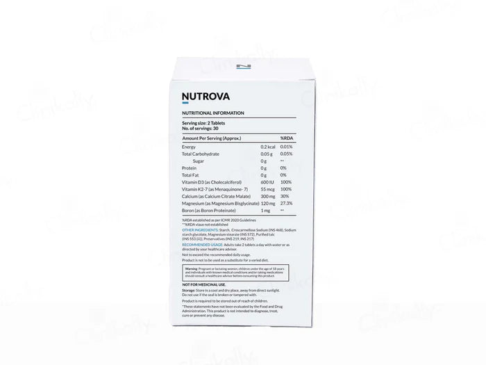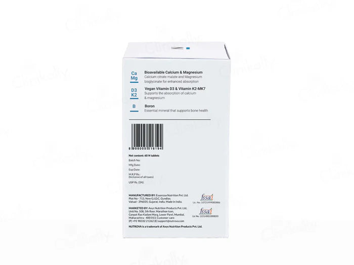 Nutrova Calcium + Magnesium Health Supplement Tablet contains bioavailable forms of calcium and magnesium, with added Vitamin D3, K2, and Boron for enhanced absorption and effectiveness.