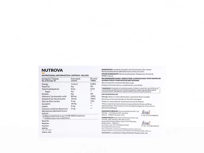Nutrova Caroshield Nutraceutical Capsule is an antioxidant-rich supplement designed to support skin health and protect against oxidative stress.