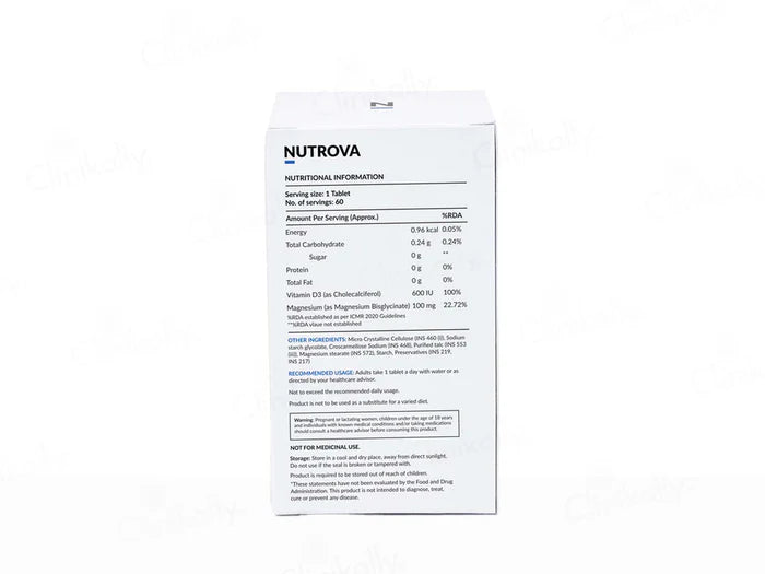 Store Nutrova Magnesium + D3 Health Supplement Tablet in a cool, dry place, away from direct sunlight, and out of reach of children.