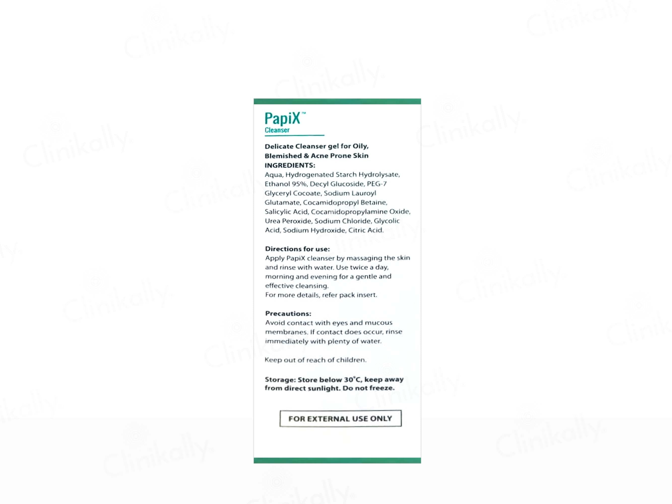 PapiX Cleanser is a delicate, rinse-off cleanser specifically formulated for acne-prone skin. It provides thorough yet non-aggressive cleansing by omitting surfactants, which are known to aggravate acne. The cleanser effectively reduces excess sebum, a contributing factor to acne development, and contains active ingredients like salicylic acid, glycolic acid, and urea peroxide to support clearer skin.