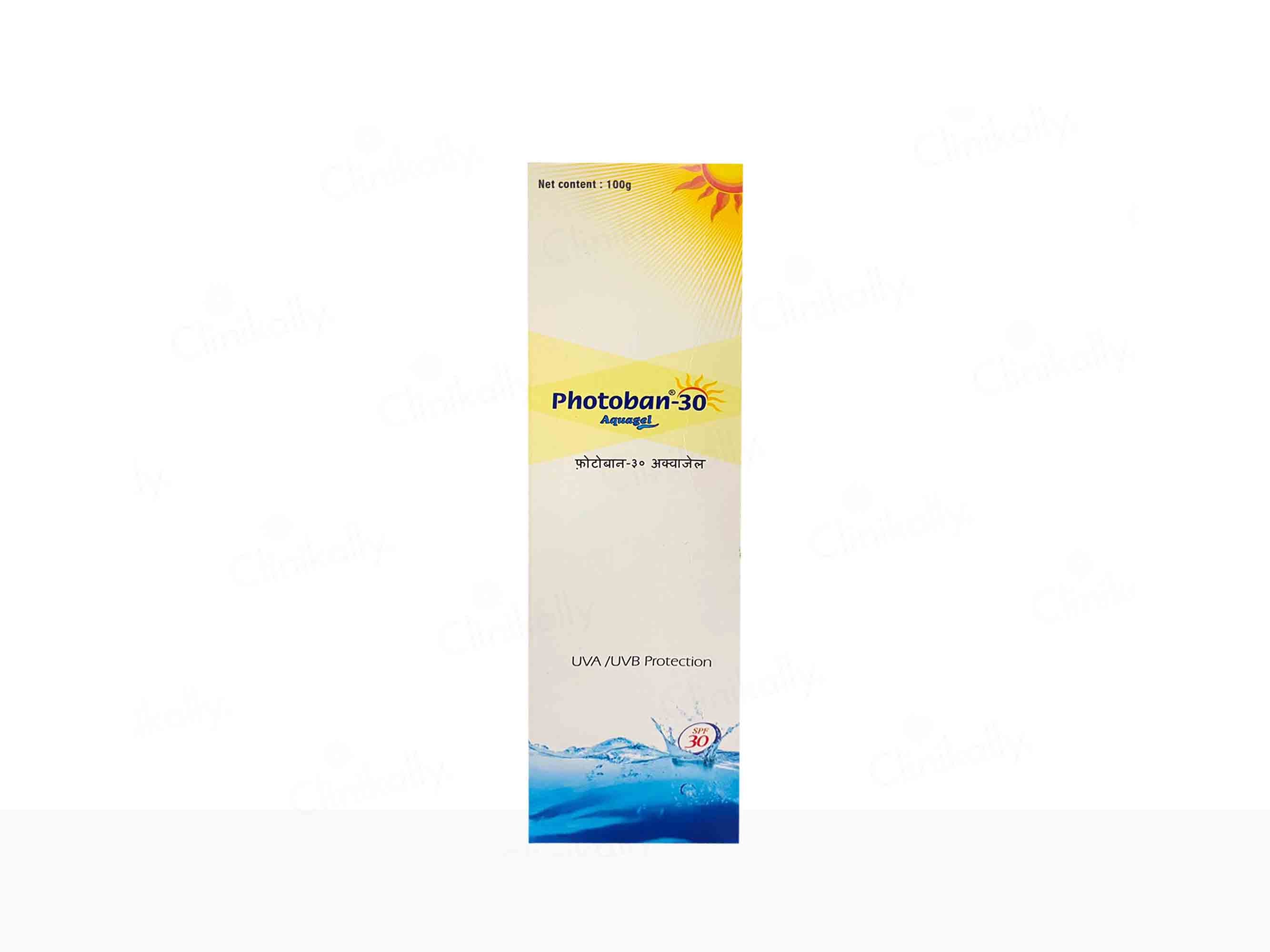 Photoban-30 Aquagel is a water-resistant sunscreen gel that provides broad-spectrum UVA and UVB protection with SPF 30, preventing sunburn, photodamage, and dry skin.