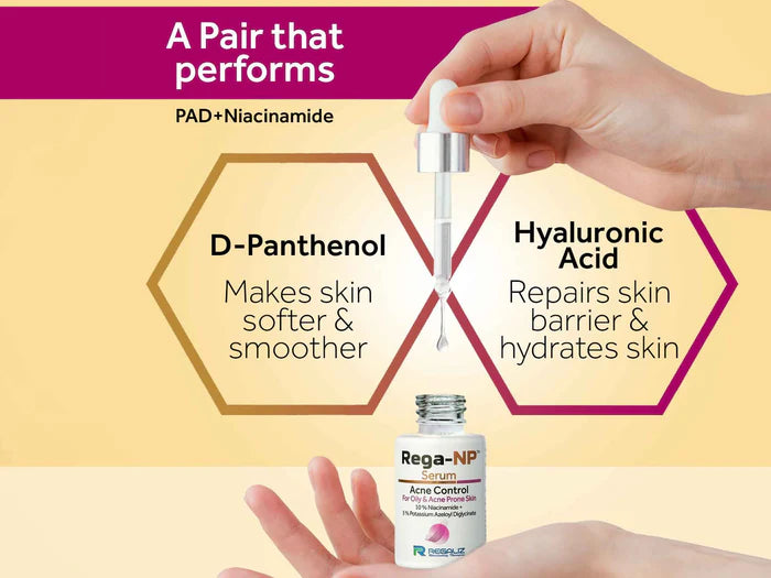 Rega-NP Acne Control Serum is a skincare treatment designed to combat acne, regulate oil production, and soothe skin with niacinamide, pantothenic acid, and botanical extracts.