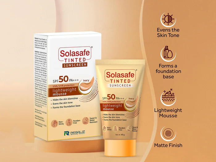 Solasafe Tinted Lightweight Mousse Sunscreen SPF 50 PA+++ (Ivory) is a broad-spectrum sunscreen designed to protect skin from UVA and UVB rays while evening out skin tone. With a lightweight, non-comedogenic formula, it hides blemishes, provides a natural finish, and is suitable for daily use on all skin types. Ideal for 15-30 minutes prior to sun exposure.