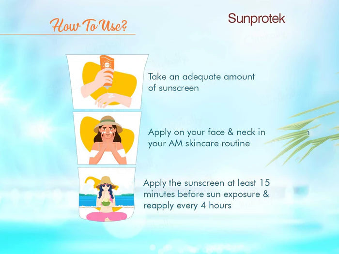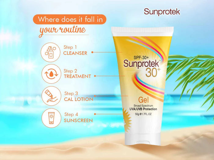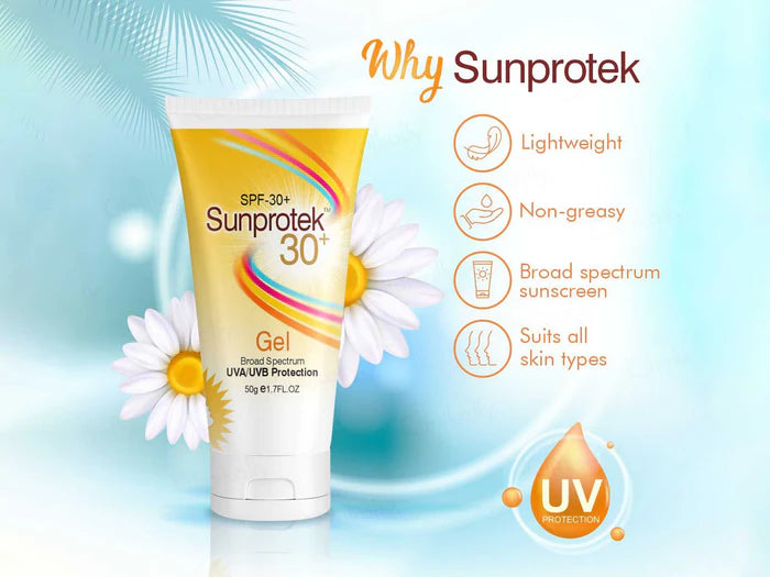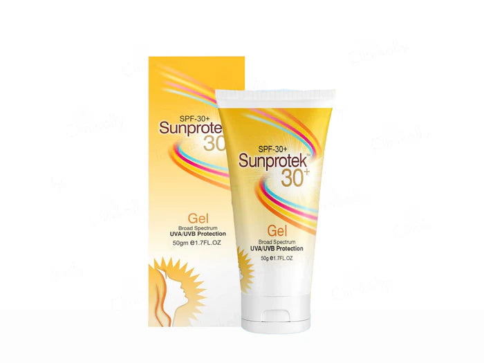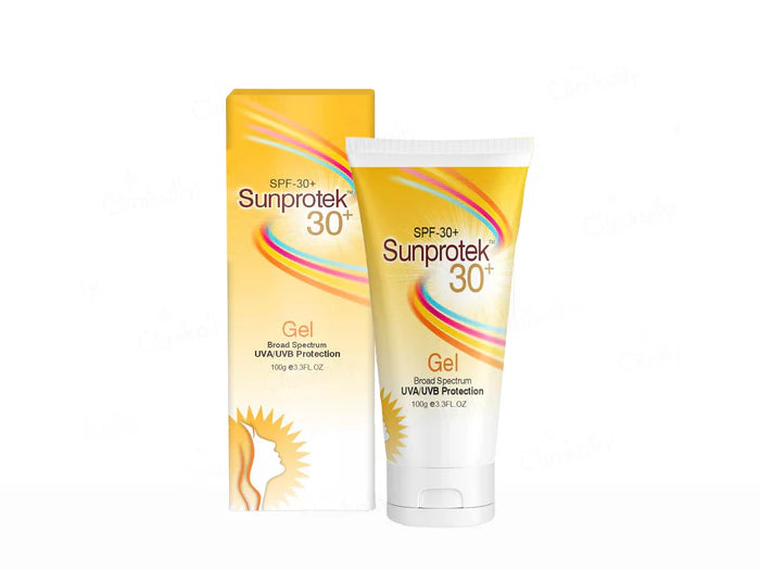 Sunprotek Sunscreen Gel SPF 30+ PA+++ provides high-level protection against UVA and UVB rays with a lightweight, non-greasy formula suitable for oily and acne-prone skin.