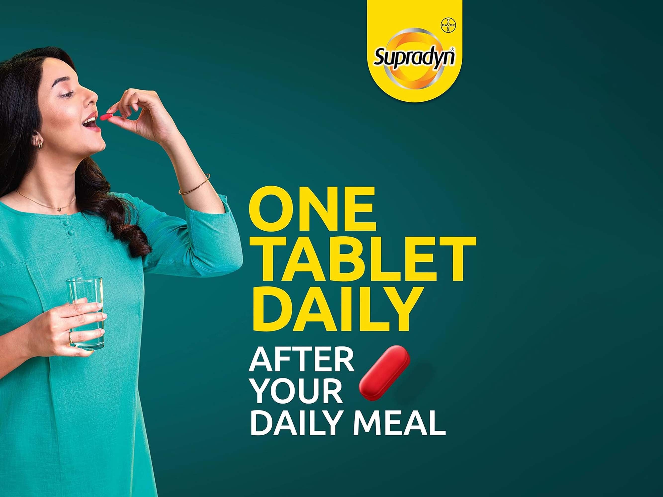 Supradyn Immuno+ Multivitamin Tablet with Turmeric & Tulsi is a holistic dietary supplement designed to boost immunity and overall vitality for adults, especially heavy work women. Enriched with natural turmeric and tulsi extracts, it provides anti-inflammatory properties, supports respiratory health, and enhances energy levels with essential vitamins and minerals like Vitamin C, Zinc, and Vitamin D.