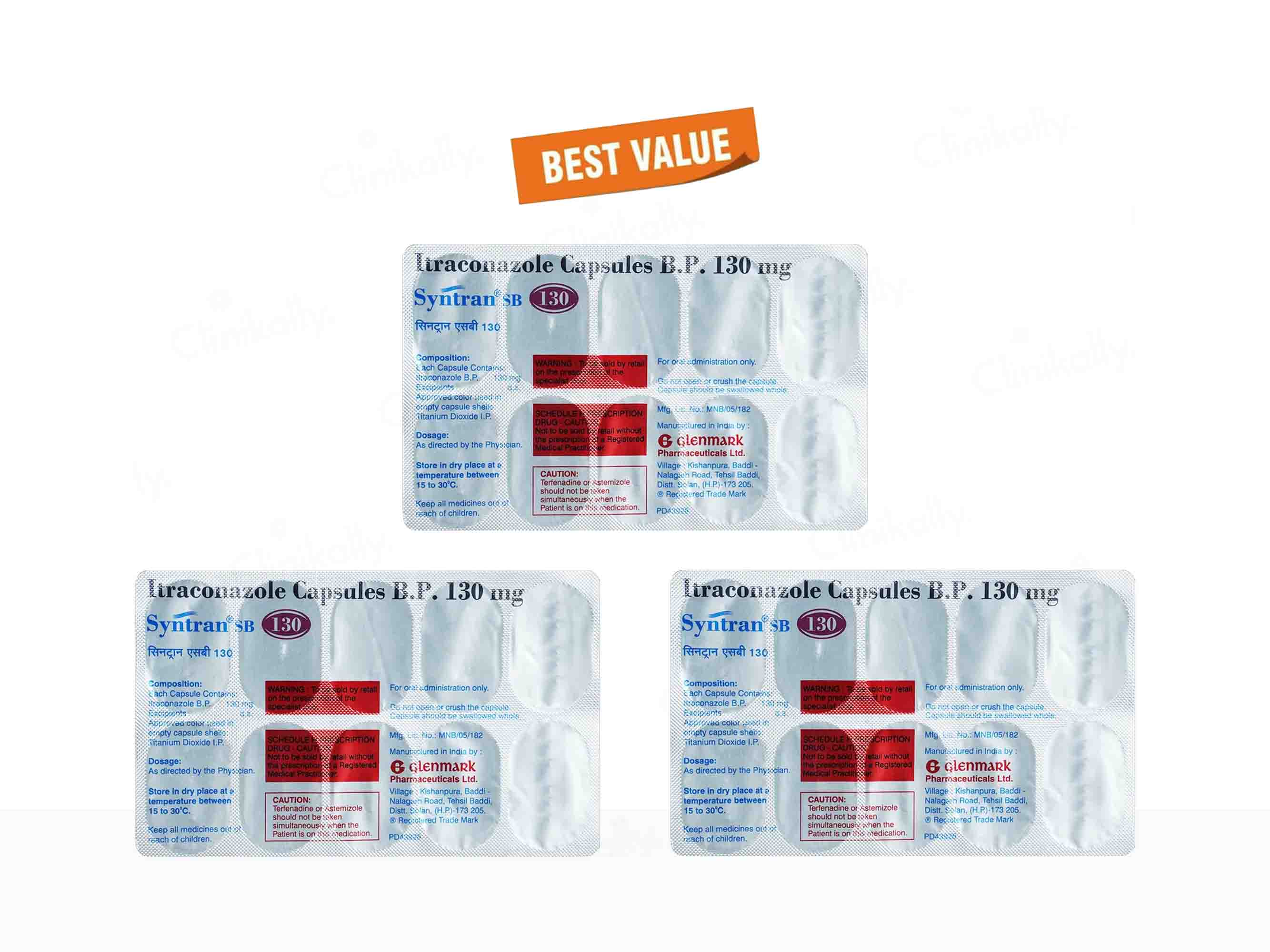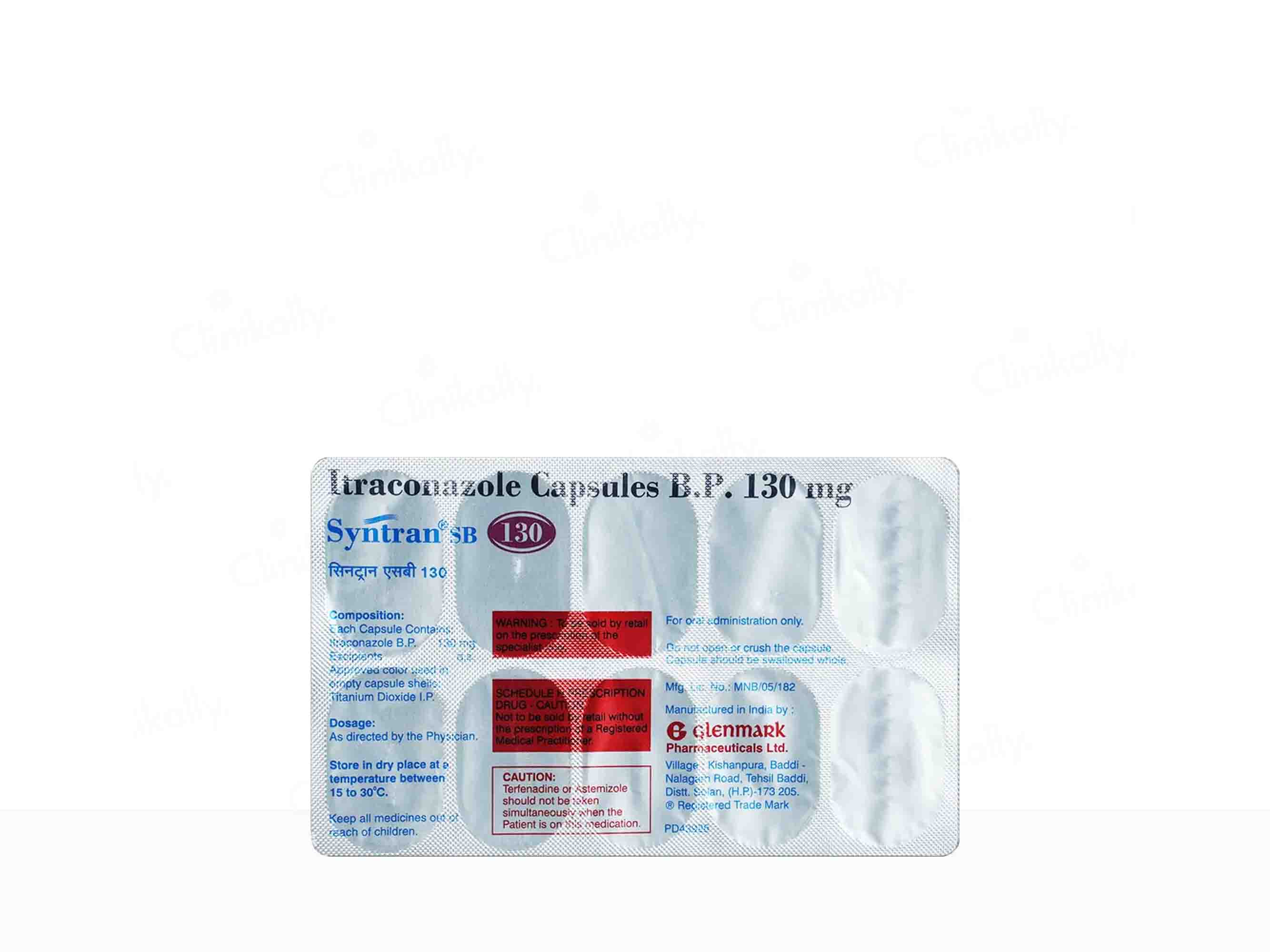 Syntran SB 130 Capsule is an antifungal medication effective in treating various fungal infections including those affecting the mouth, throat, vagina, as well as fingernails and toenails. It operates by inhibiting the growth of fungi, targeting and destroying the fungal cell membrane. This action not only stops the spread of the fungi but also kills them, providing relief from the infection and promoting the healing of affected areas. It's a targeted treatment option for patients dealing with fungal infections in different parts of the body.