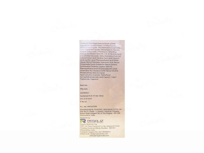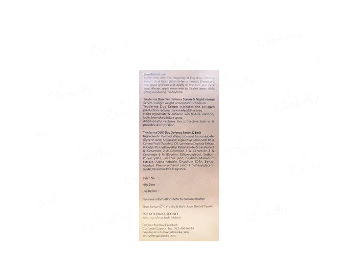 Truderma Duo Age Renewal Serum is a powerful anti-aging formula designed to rejuvenate and revitalize the skin. This serum combines advanced ingredients that target fine lines, wrinkles, and uneven skin tone, promoting a youthful glow. With its lightweight, fast-absorbing texture, it penetrates deeply to hydrate and firm the skin, enhancing elasticity and smoothness. Suitable for all skin types, Truderma Duo Age Renewal Serum is perfect for daily use to achieve radiant, youthful-looking skin.