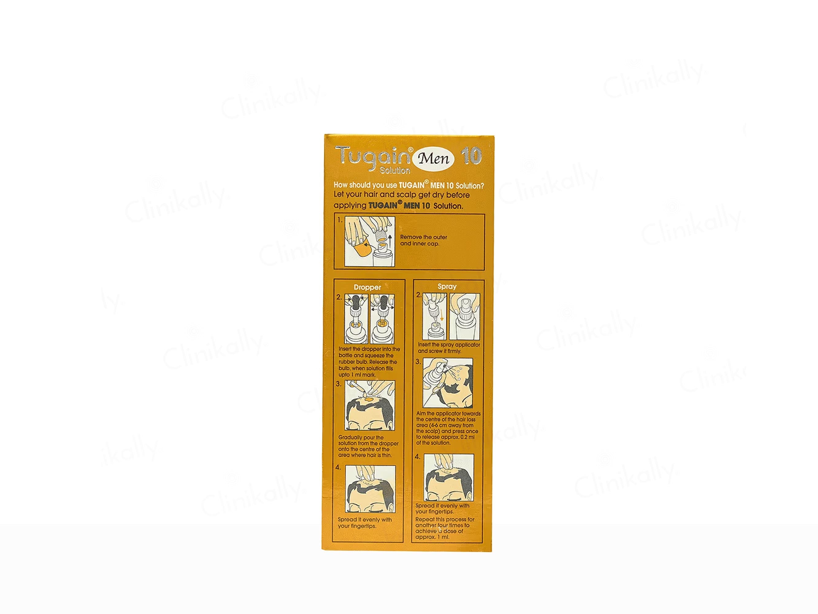 Tugain Men 10 Topical Solution is a trusted remedy for hair loss and baldness. Featuring Minoxidil and Finasteride, it effectively promotes hair regrowth, especially in men suffering from male pattern baldness. This easy-to-apply solution revitalizes hair follicles, increasing hair density and thickness. It's a reliable choice for regaining a fuller, more youthful head of hair and boosting self-confidence.