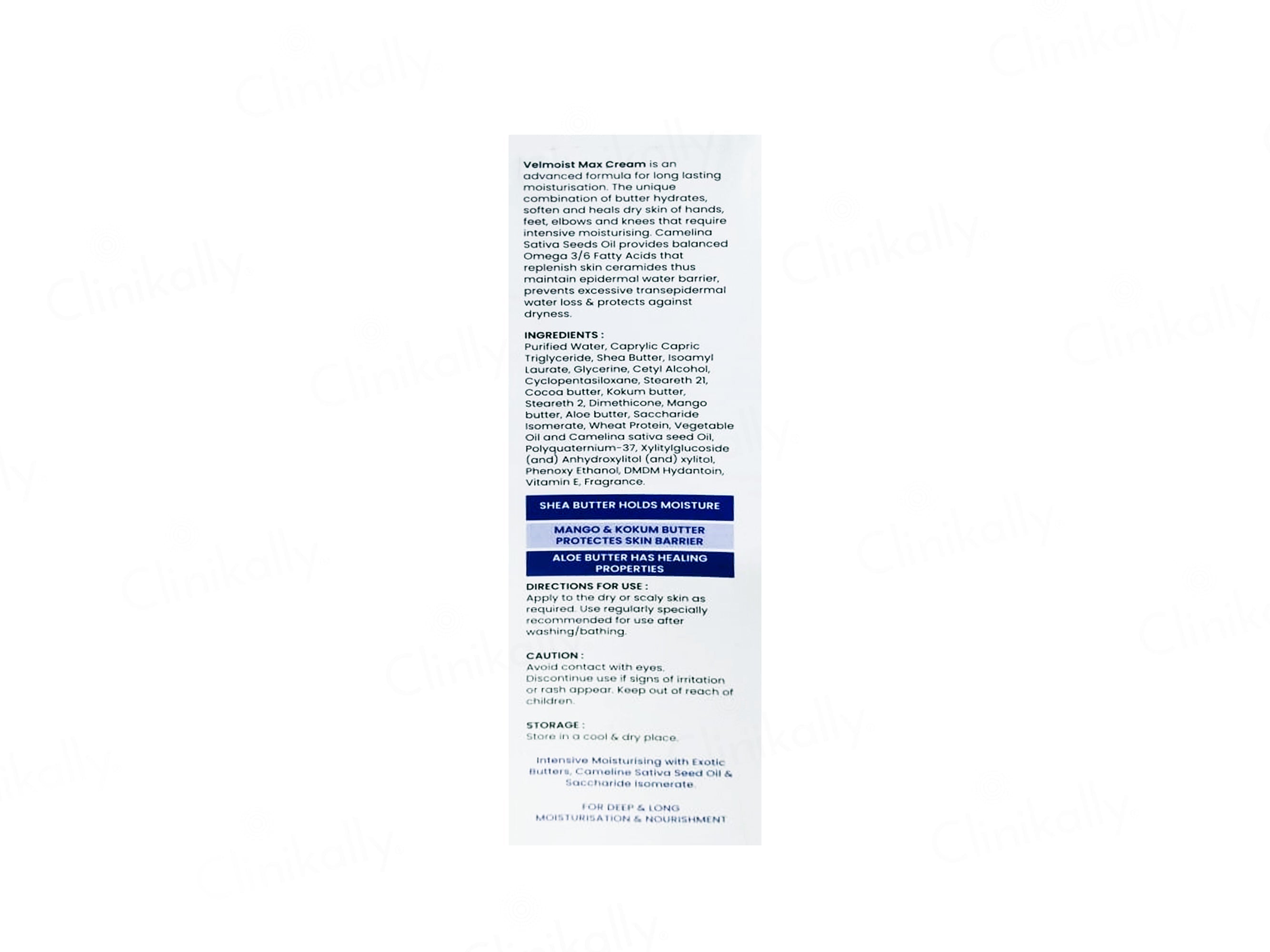 Velmoist Max Intensive Moisturising Cream For Dry & Sensitive Skin is a skincare product designed to deeply hydrate, repair, and protect dry and sensitive skin with a blend of Shea Butter, Ceramides, and Panthenol. Enriched with Aloe Vera and Glycerin, it soothes irritation, strengthens the skin barrier, and leaves a rich, non-greasy finish. This cream, suitable for daily use on dry and sensitive skin types, delivers long-lasting moisture benefits.